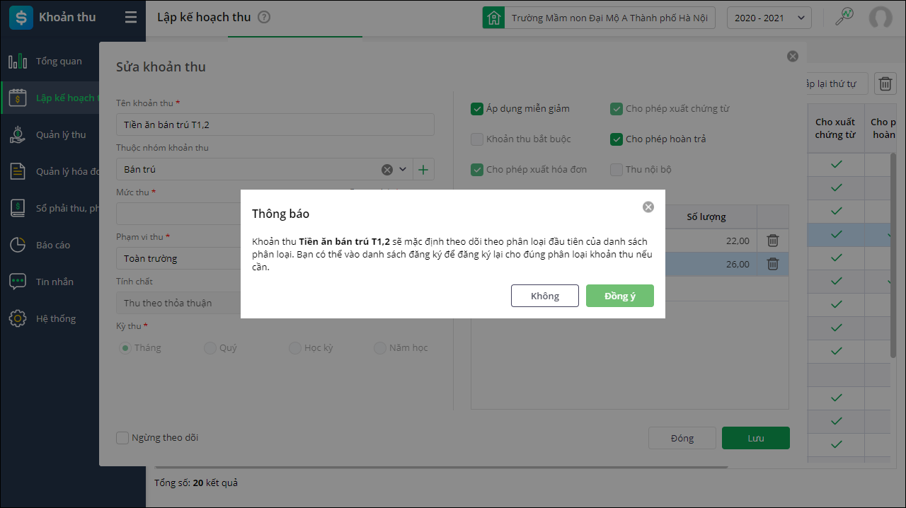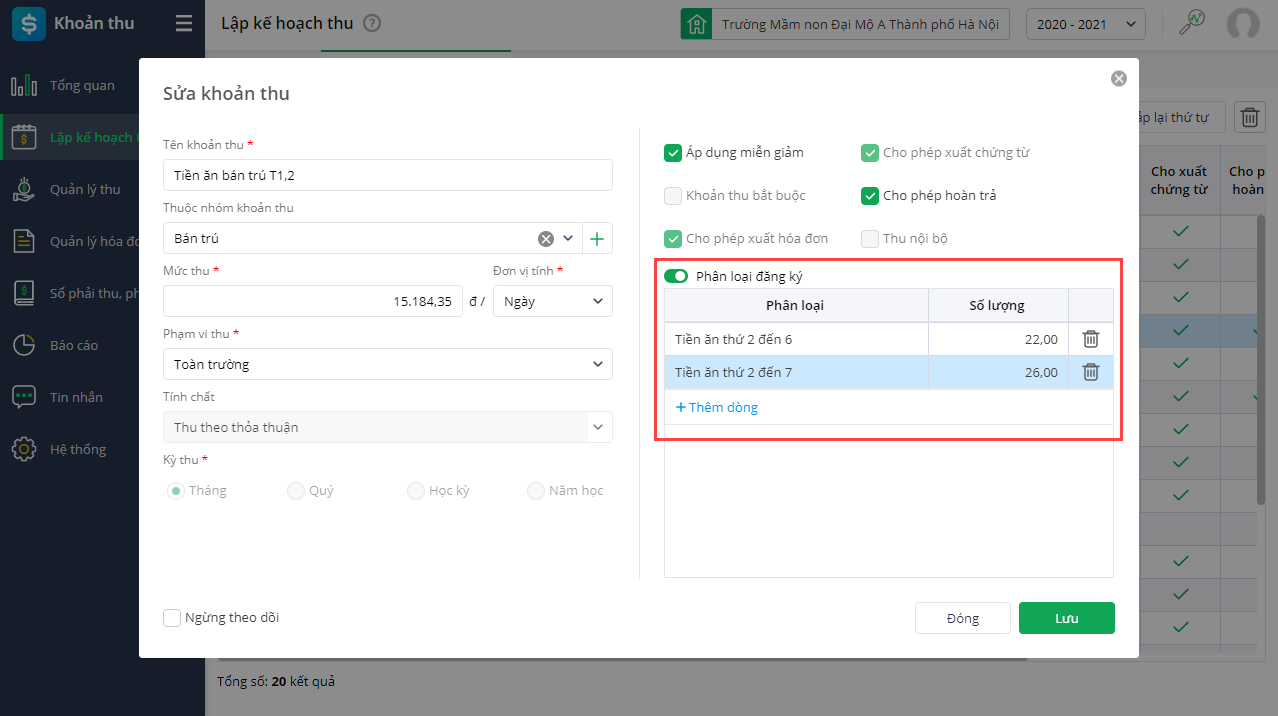 Bước 1: Phân loại đăng ký khoản thu tại màn hình Danh sách khoản thu