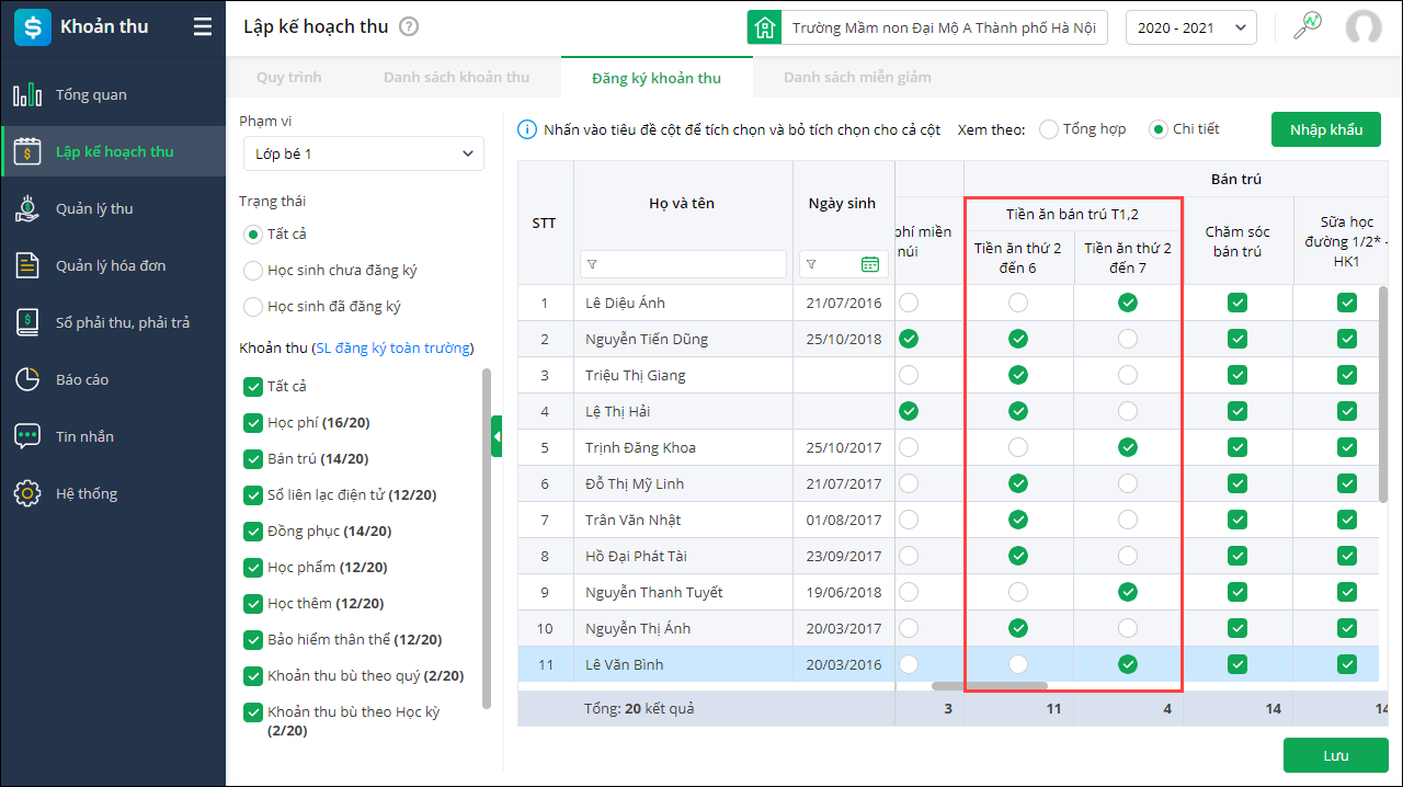 - Trường hợp theo phạm vi anh/chị chọn (Toàn trường, khối, lớp), các học sinh đăng ký các khoản thu không giống nhau, anh/chị thực hiện đăng ký trên màn hình chi tiết.