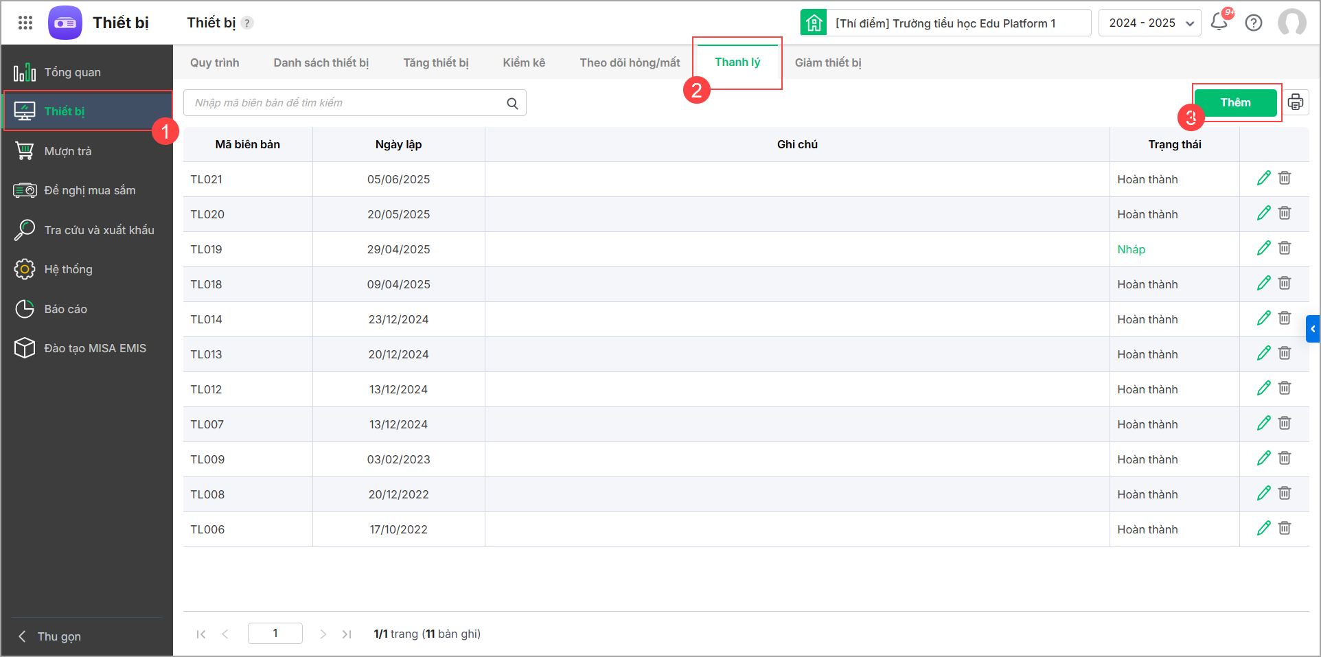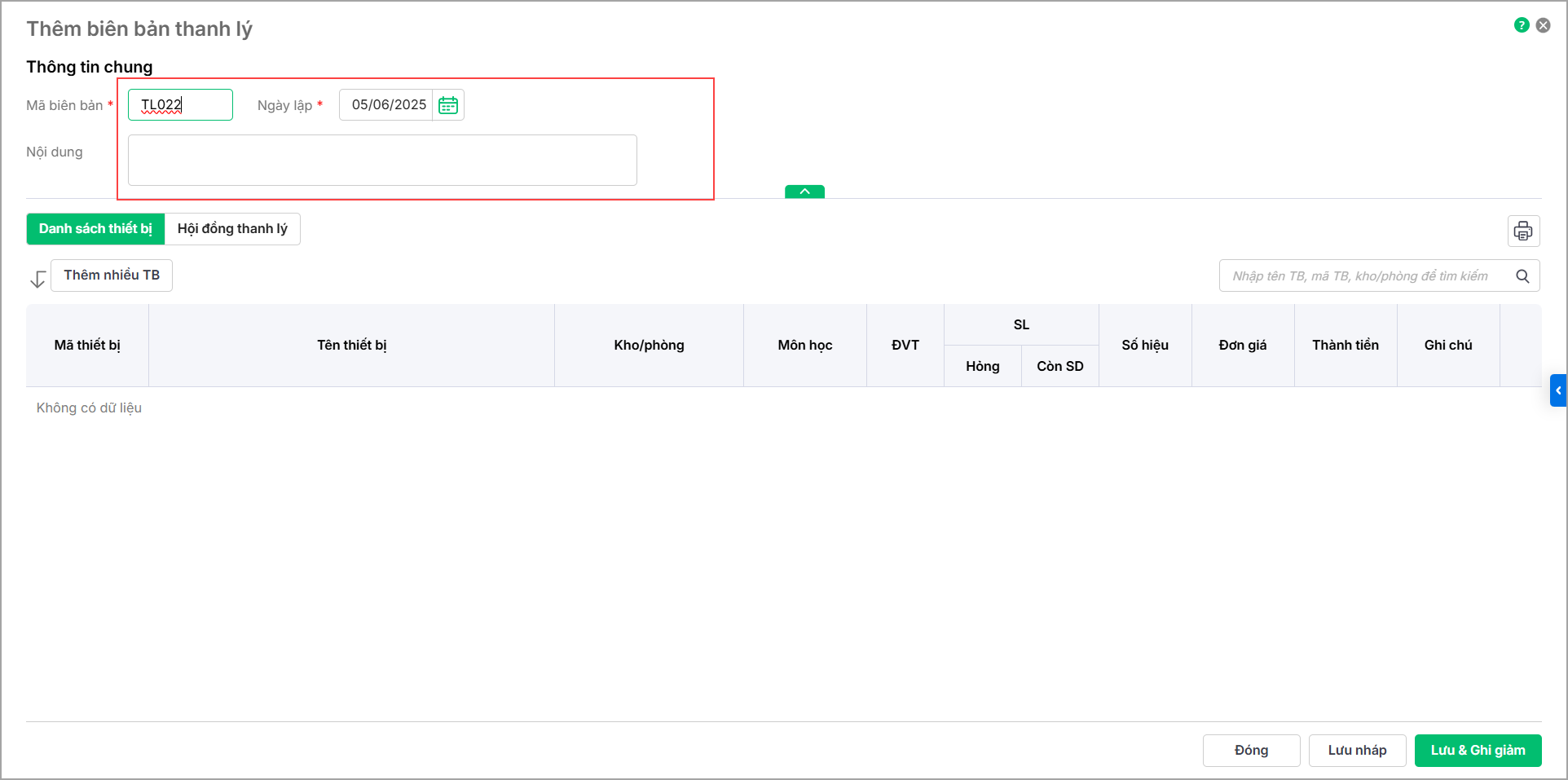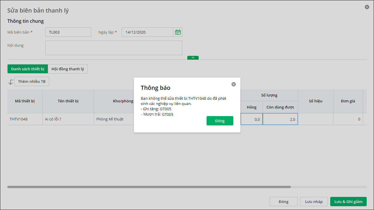 Lưu ý: Trường hợp trong biên bản thanh lý thiết bị có thiết bị đã phát sinh các nghiệp vụ tăng, mượn trả thiết bị thì anh/chị không được phép sửa thông tin thanh lý thiết bị đó.