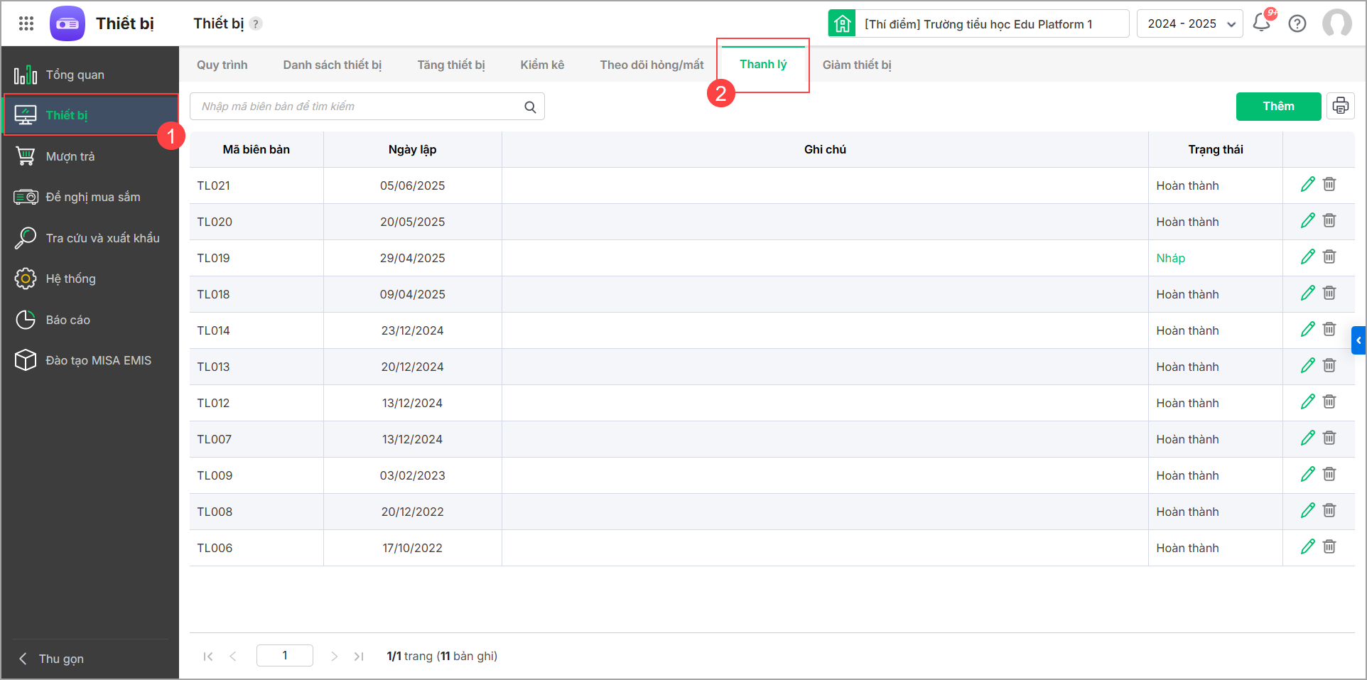 - Vào Thiết bị\Thanh lý. Nhấn biểu tượng “thùng rác” tại thiết bị muốn xóa để xóa từng phiếu ghi giảm thiết bị