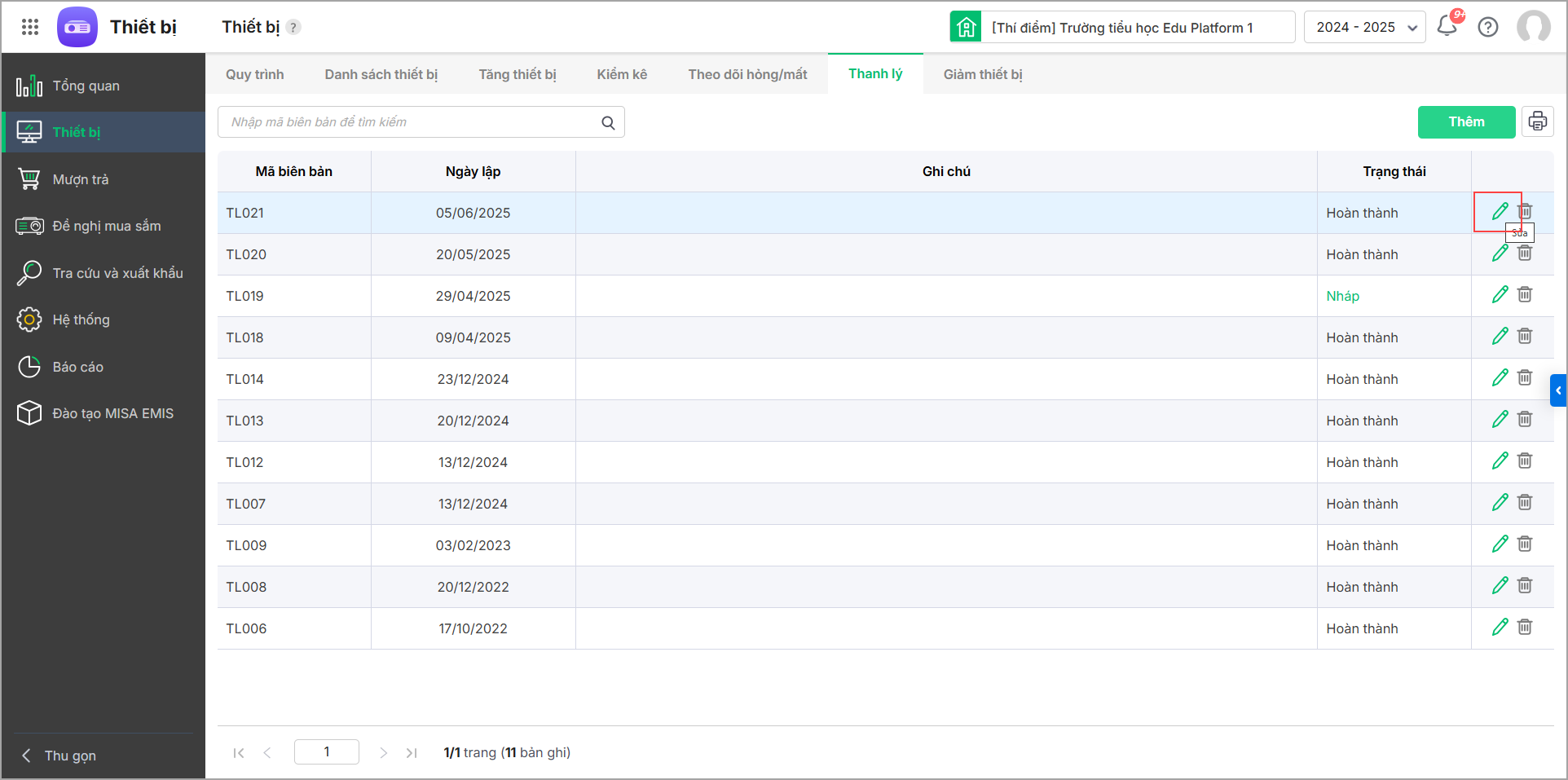 - Nháy đúp chuột hoặc nhấn vào biểu tượng cây bút tại biên bản thanh lý thiết bị muốn chỉnh sửa.