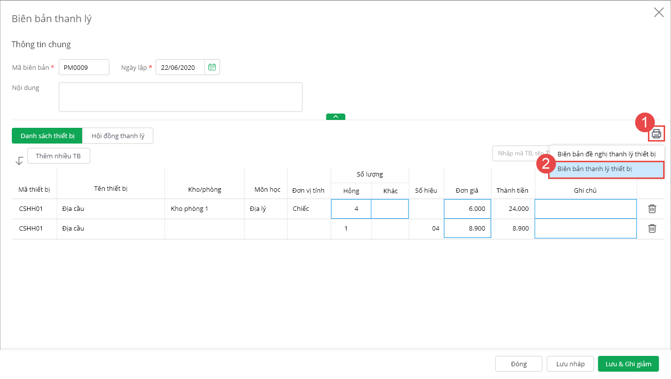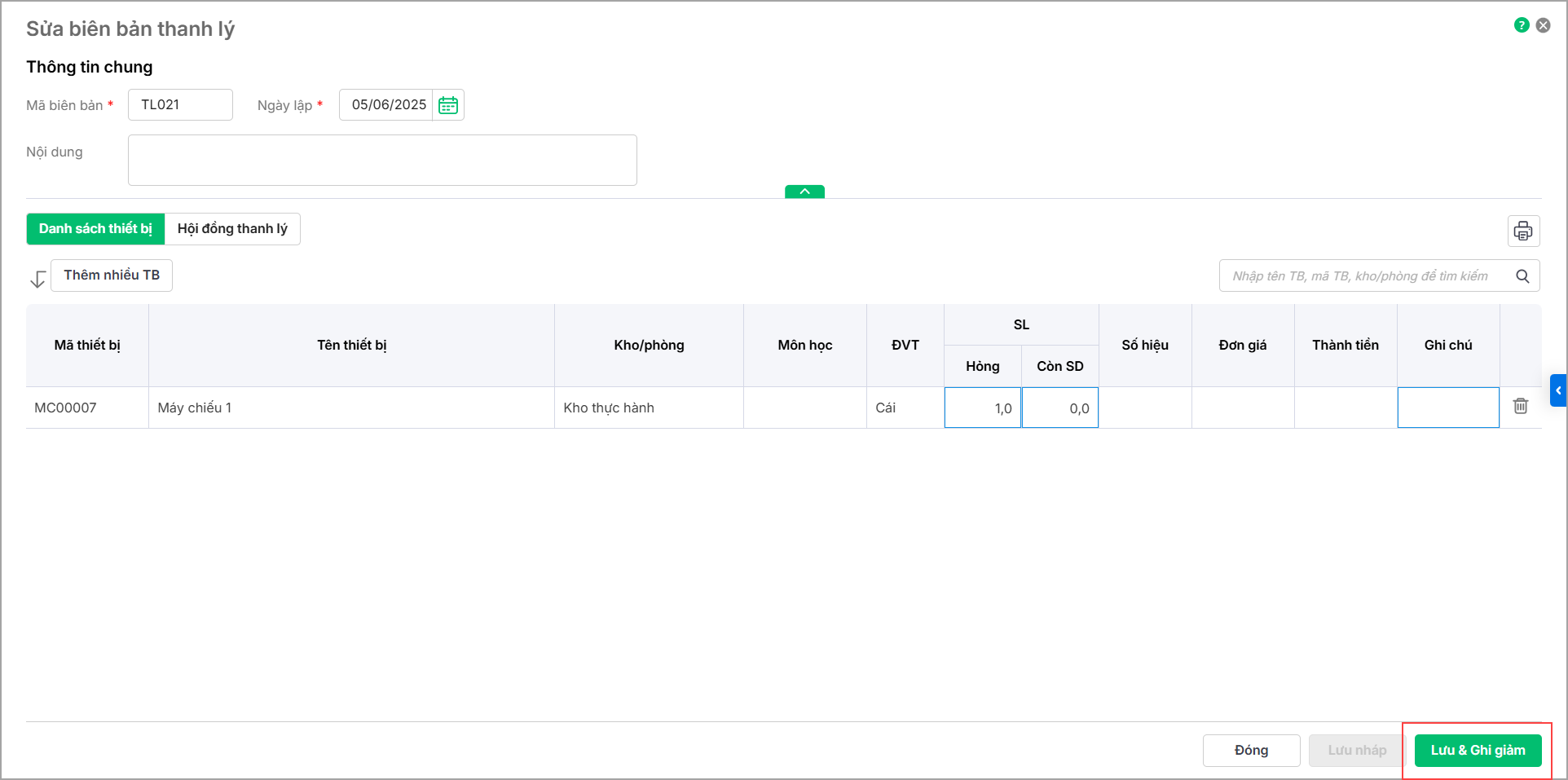 - Chỉnh sửa thông tin trên biên bản thanh lý, nhấn Lưu và Ghi giảm