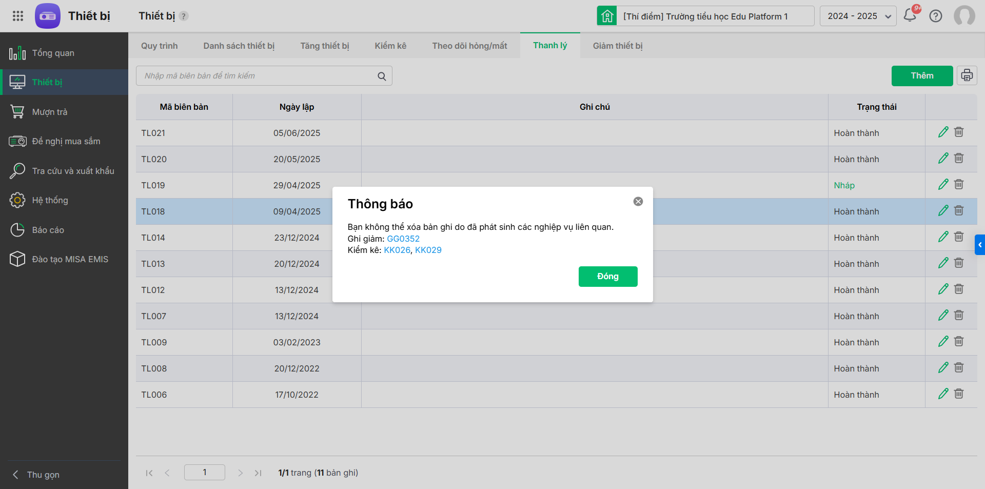 Lưu ý: Trường hợp trong biên bản thanh lý thiết bị có thiết bị đã phát sinh các nghiệp vụ tăng, mượn trả thiết bị thì anh/chị không được phép xóa thông tin thanh lý thiết bị đó.|