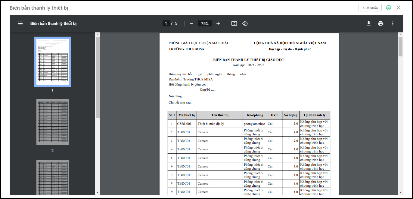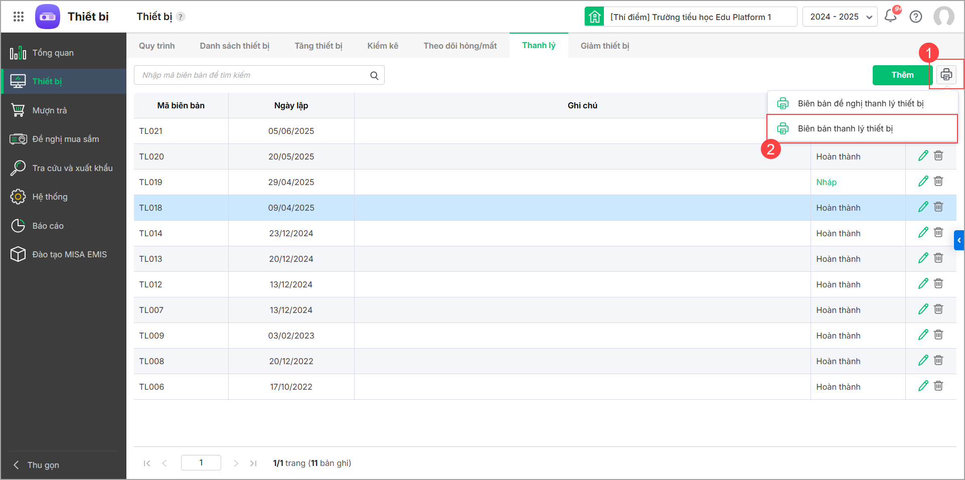 - Chọn biên bản, nhấn vào Máy in/Biên bản thanh lý thiết bị để in biên bản.