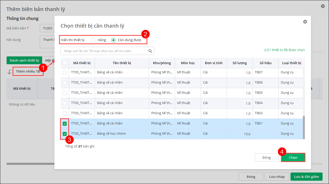 - Tích chọn các thiết bị cần thanh lý, nhấn Chọn