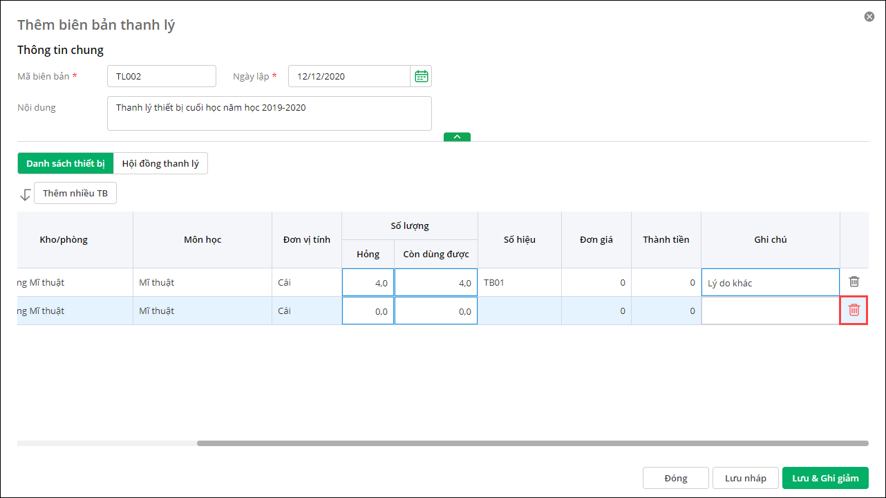 - Anh/chị có thể nhấn biểu tượng thùng rác tại thiết bị để xóa thông tin thiết bị đó khỏi biên bản thanh lý.