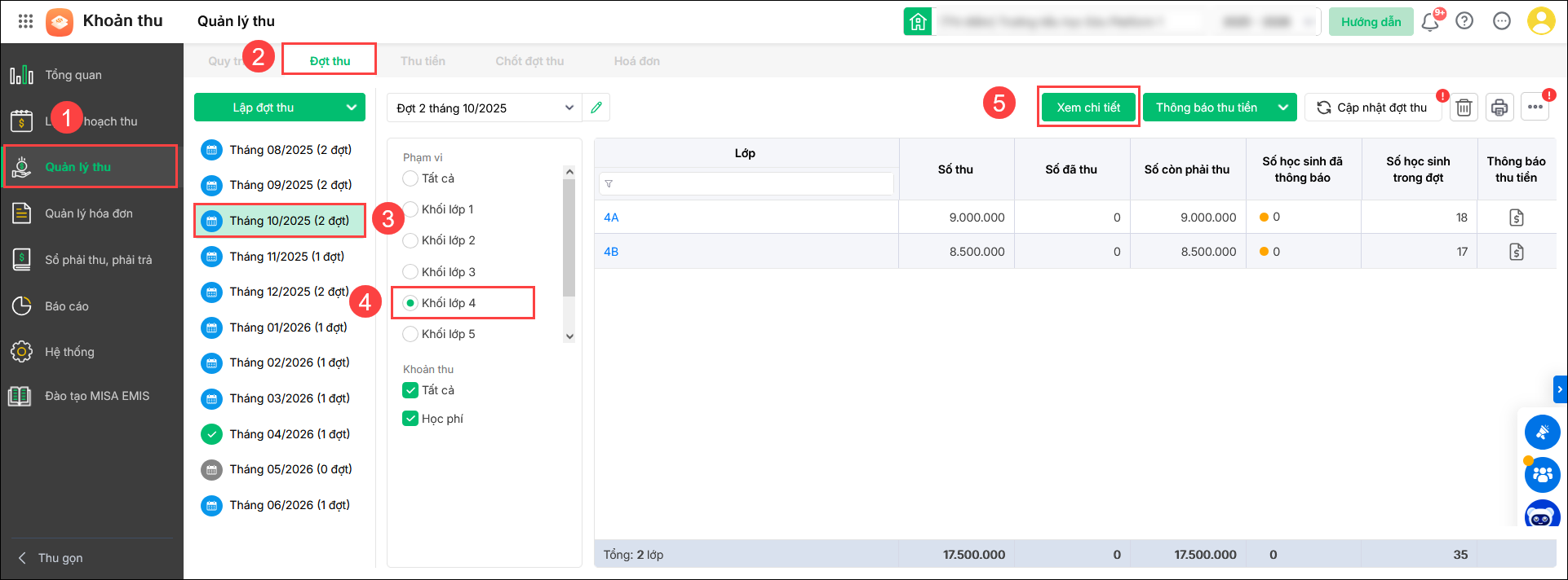 2. Vào Quản lý thu\Đợt thu, chọn đợt thu, khối lớp và nhấn vào Xem chi tiết.