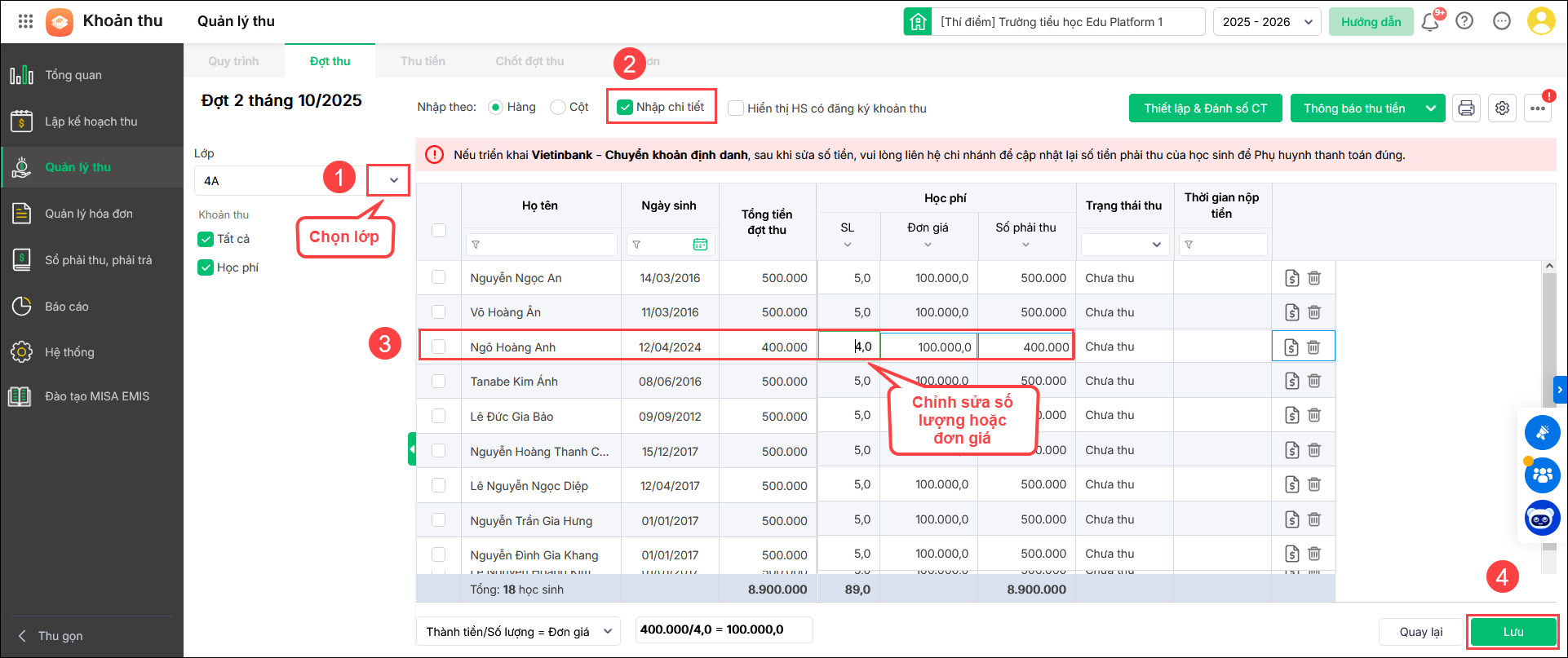 - Tuy nhiên, học sinh chuyển đến giữa tháng, giữa năm nên bạn muốn chỉnh sửa nhanh lại số phải thu của học sinh này trên đợt thu đã lập