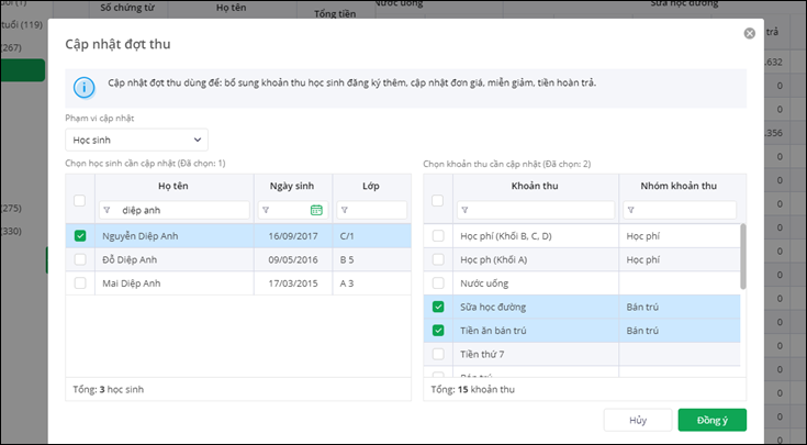 - Chỉnh sửa lại số lượng khoản thu đó, sửa lại SL của tiền ăn = số lượng buổi học sinh đã ăn trong tháng (theo kết quả điểm danh).