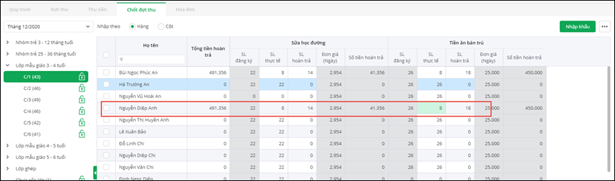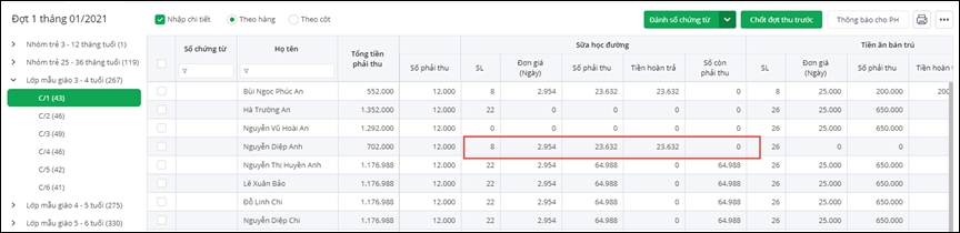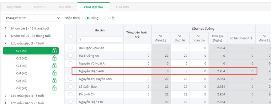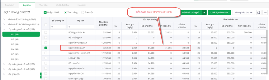 - Sau khi cập nhật thì đợt thu tháng 1 sẽ hiển thị đúng: số buổi hoàn trả =8, số phải thu = 0 => Thu tiền của học sinh