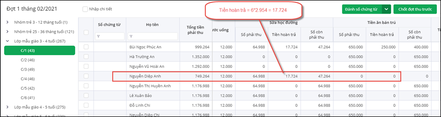Tình huống: Đến thời điểm có kết quả điểm danh cuối tháng thì phụ huynh mới đến nộp tiền. Khi đó kế toán đã xác định được học sinh đó ăn bao nhiêu buổi trong tháng => Phụ huynh chỉ muốn nộp phần tiền ăn đó, không muốn nộp thừa như cách tính ở đầu tháng của kế toán