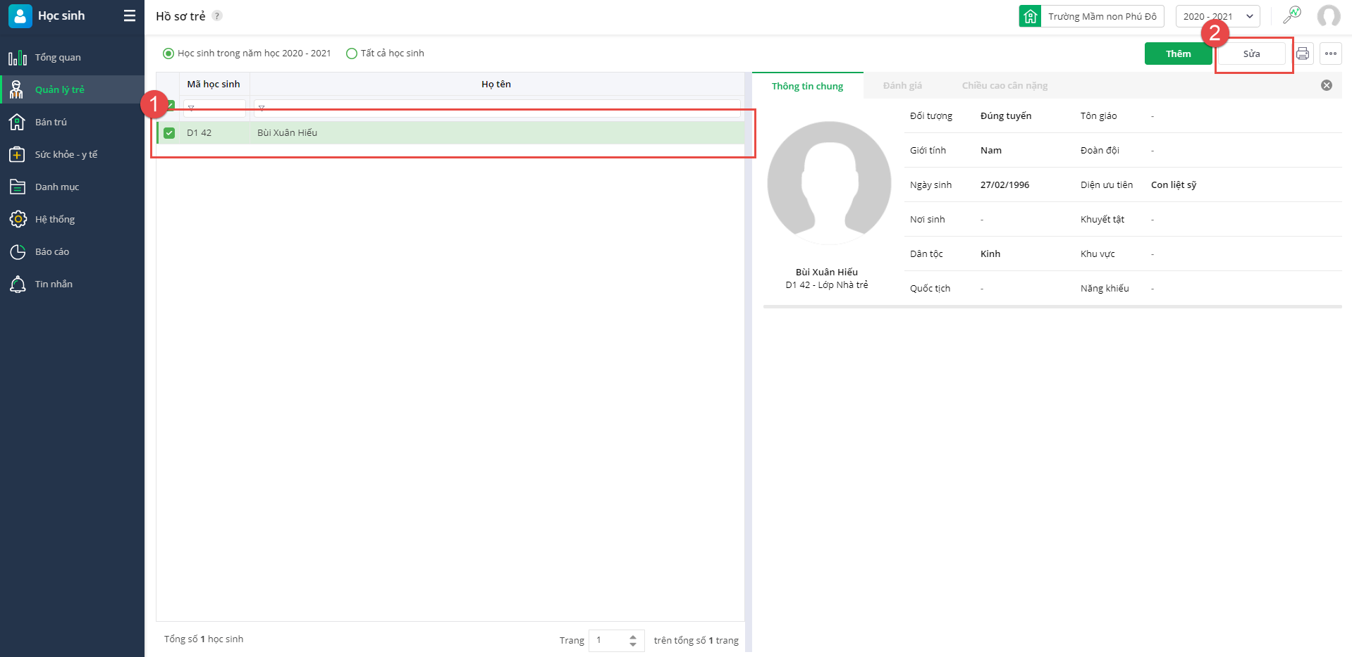 Bước 1: Trên danh sách Hồ sơ trẻ, tìm chọn học sinh cần cập nhật ảnh và nhấn Sửa.