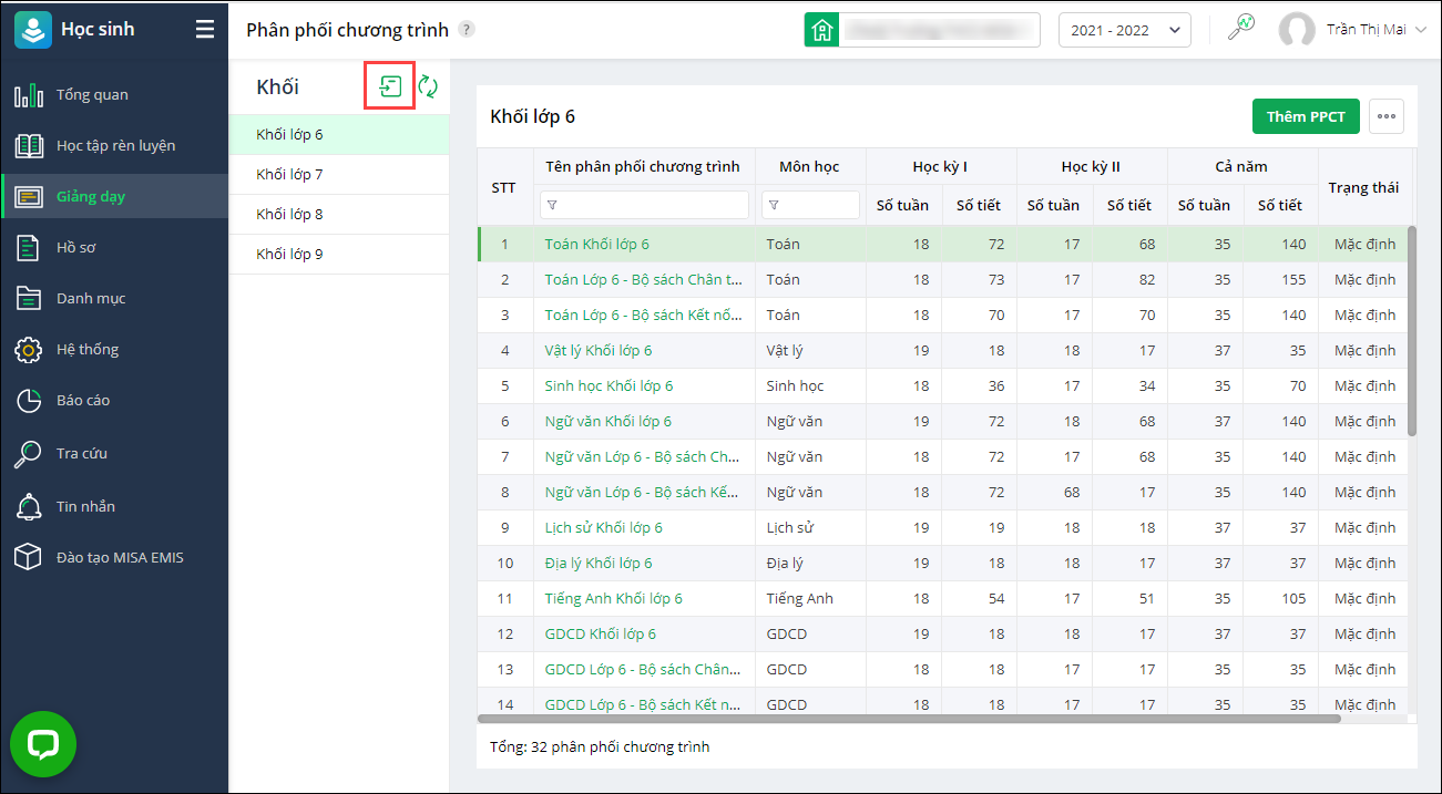 - Anh/chị thực hiện chức năng Cập nhật phân phối chương trình của Phòng/Sở Giáo dục bằng cách chọn vào biểu tượng bên dưới để đồng bộ Phân phối chương trình từ PGD/SGD.
