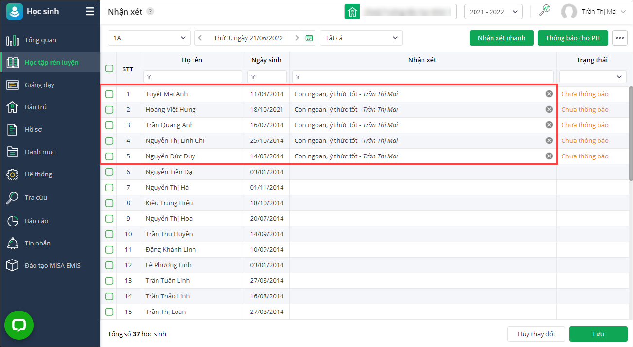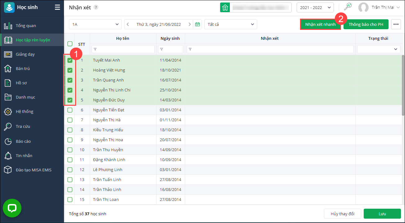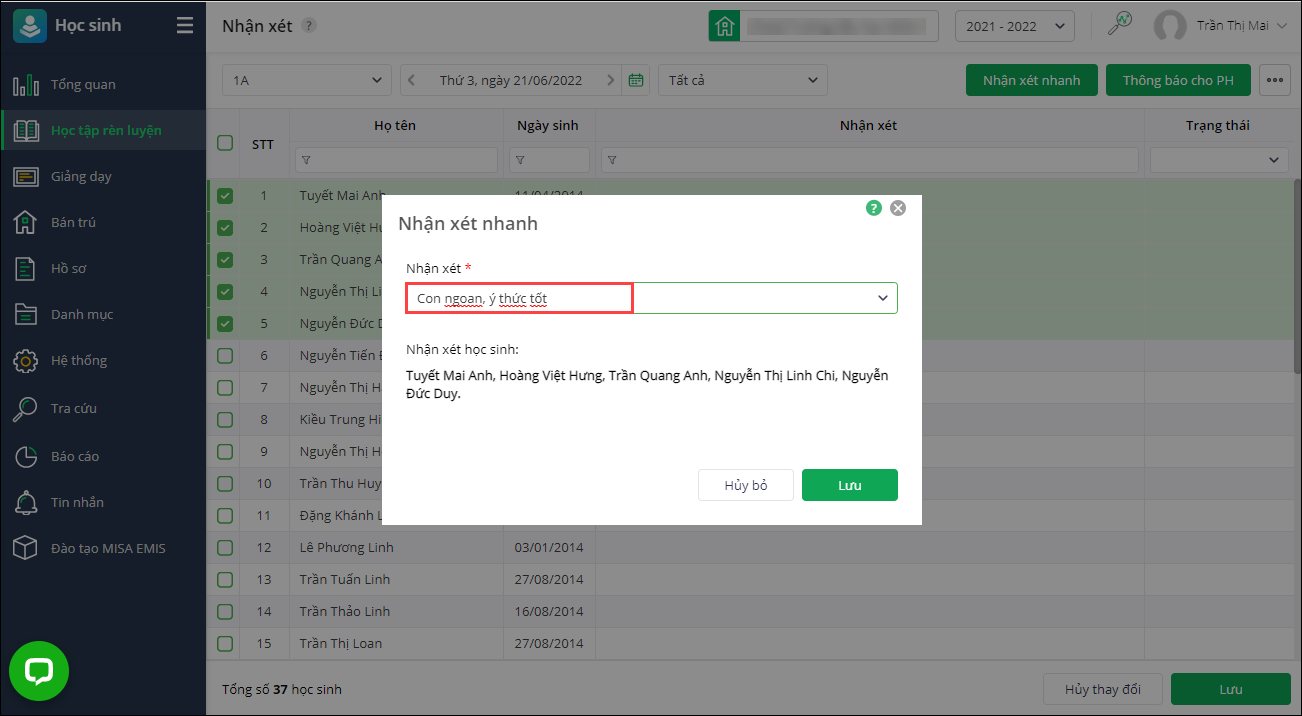 - Tích chọn những học sinh cần nhận xét, chọn Nhận xét nhanh.