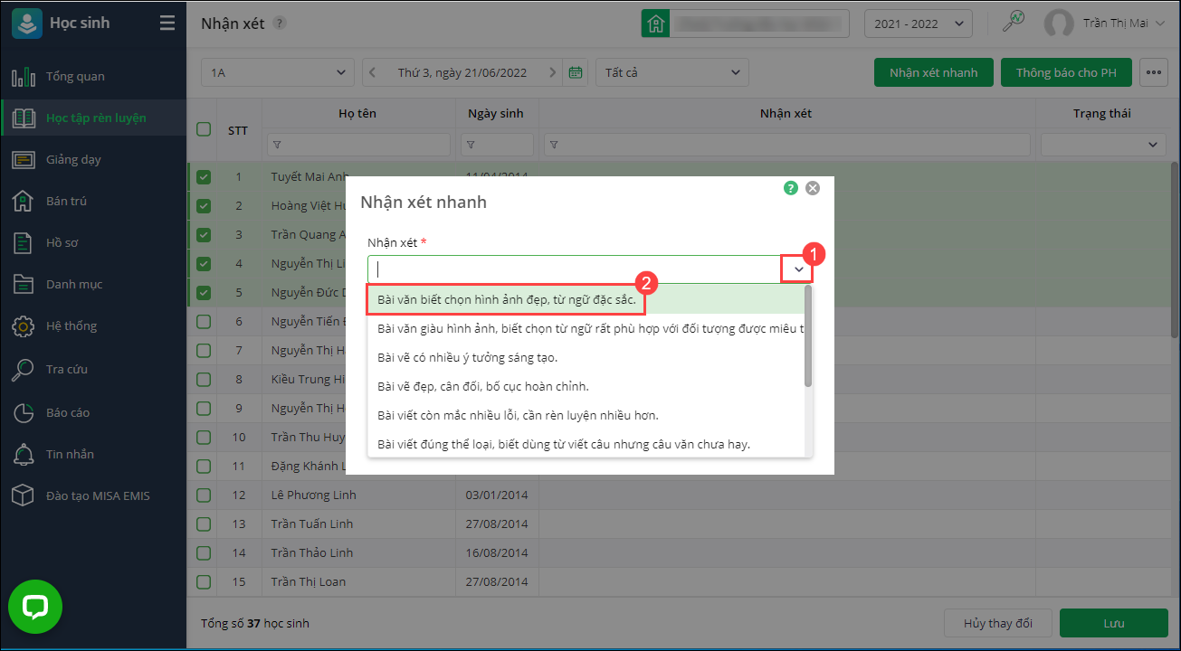 - Cách 2: Thiết lập mẫu nhận xét theo hướng dẫn tại đây, nhấn vào biểu tượng mũi tên để chọn nhanh nhận xét trong danh sách.