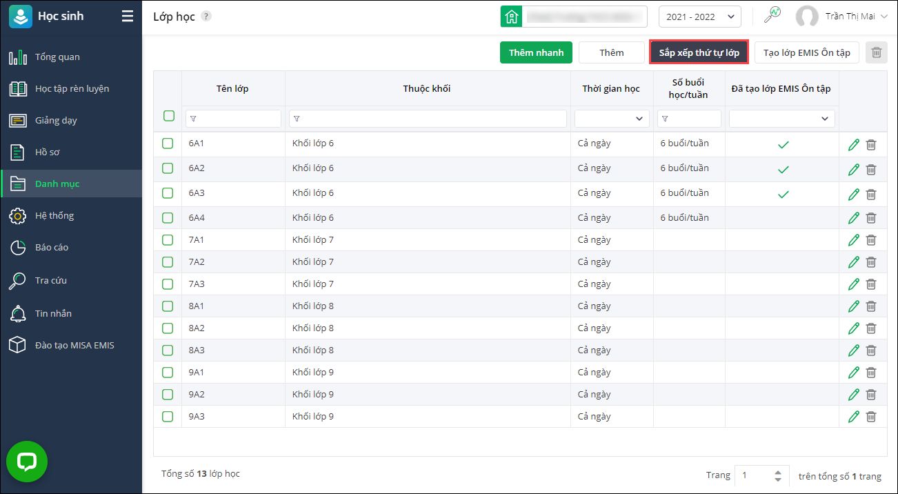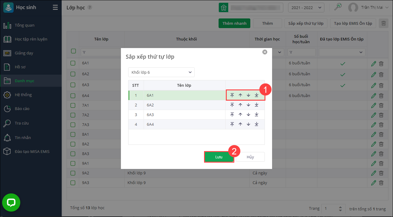 - Lựa chọn khối lớp cần sắp xếp, nhấn biểu tượng mũi tên lên xuống để sắp xếp thứ tự.