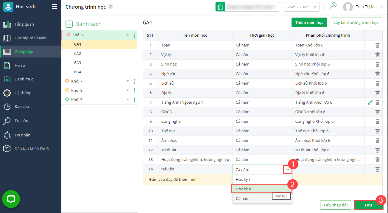 - Tại cột Thời gian học của môn học cần thiết lập, nhấn vào dấu mũi tên. Chọn thời gian tương ứng (Học kỳ I/Học kỳ II/Cả năm).