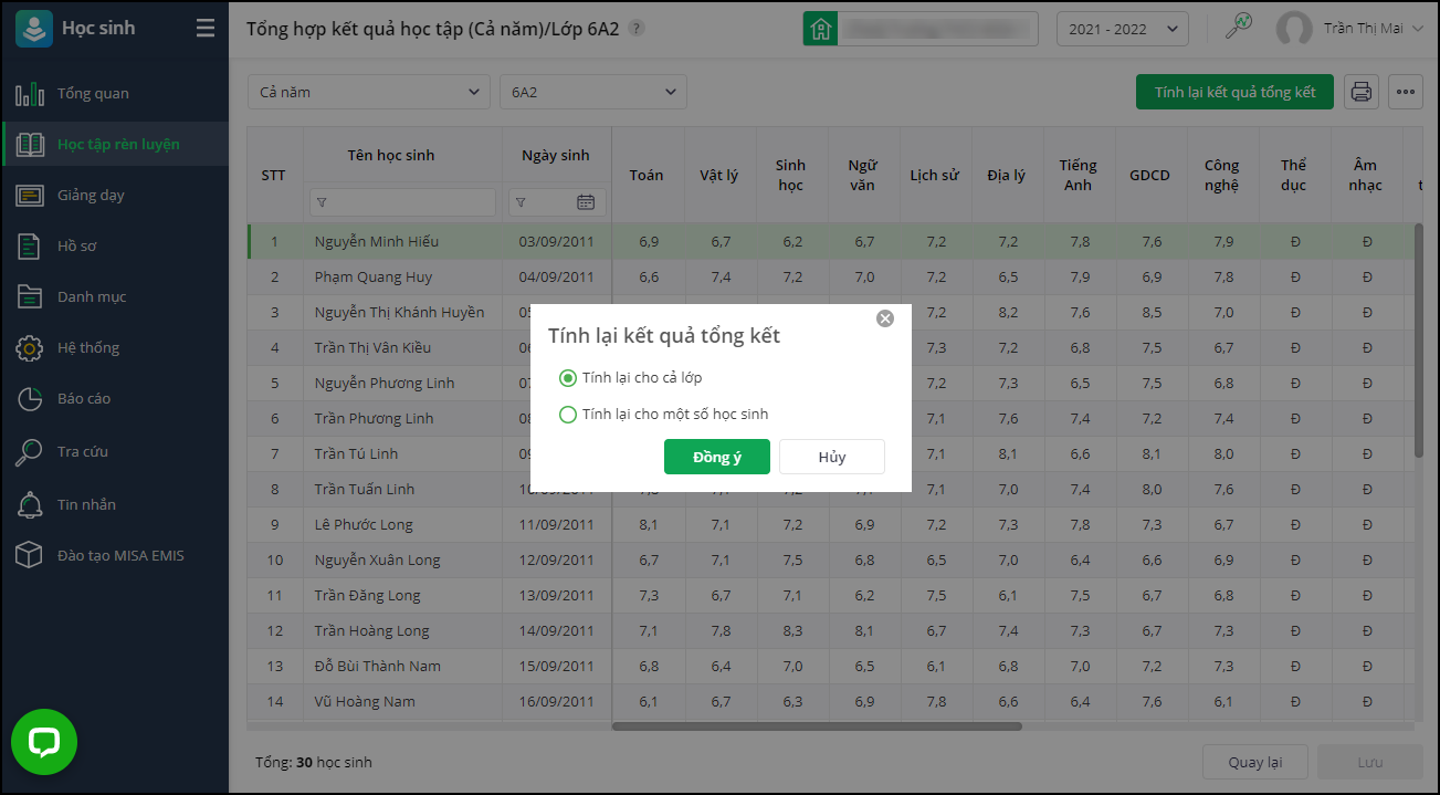 - Lựa chọn Tính lại cho cả lớp hoặc Tính lại cho một số học sinh bằng cách chọn vào ô tương ứng. Nhấn Đồng ý.