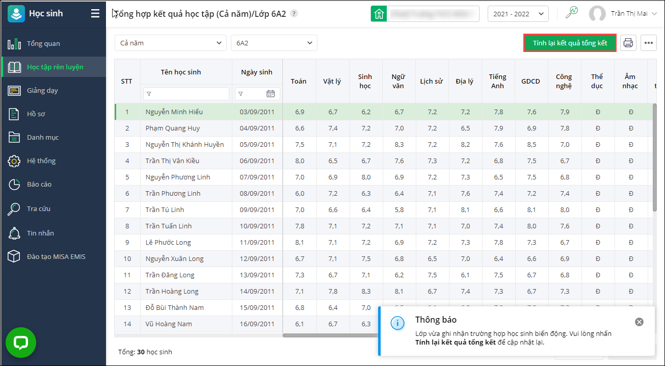 - Để khắc phục tình trạng này, GVCN/Quản trị hệ thống cần thực hiện tổng kết lại cho học sinh có thay đổi hoặc cả lớp như sau:
