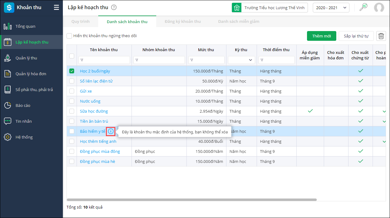 - Với các trường Tiểu học hoặc Liên cấp có Tiểu học, phần mềm mặc định mang đi khoản thu BHYT, anh/chị không được phép xóa khoản thu này.