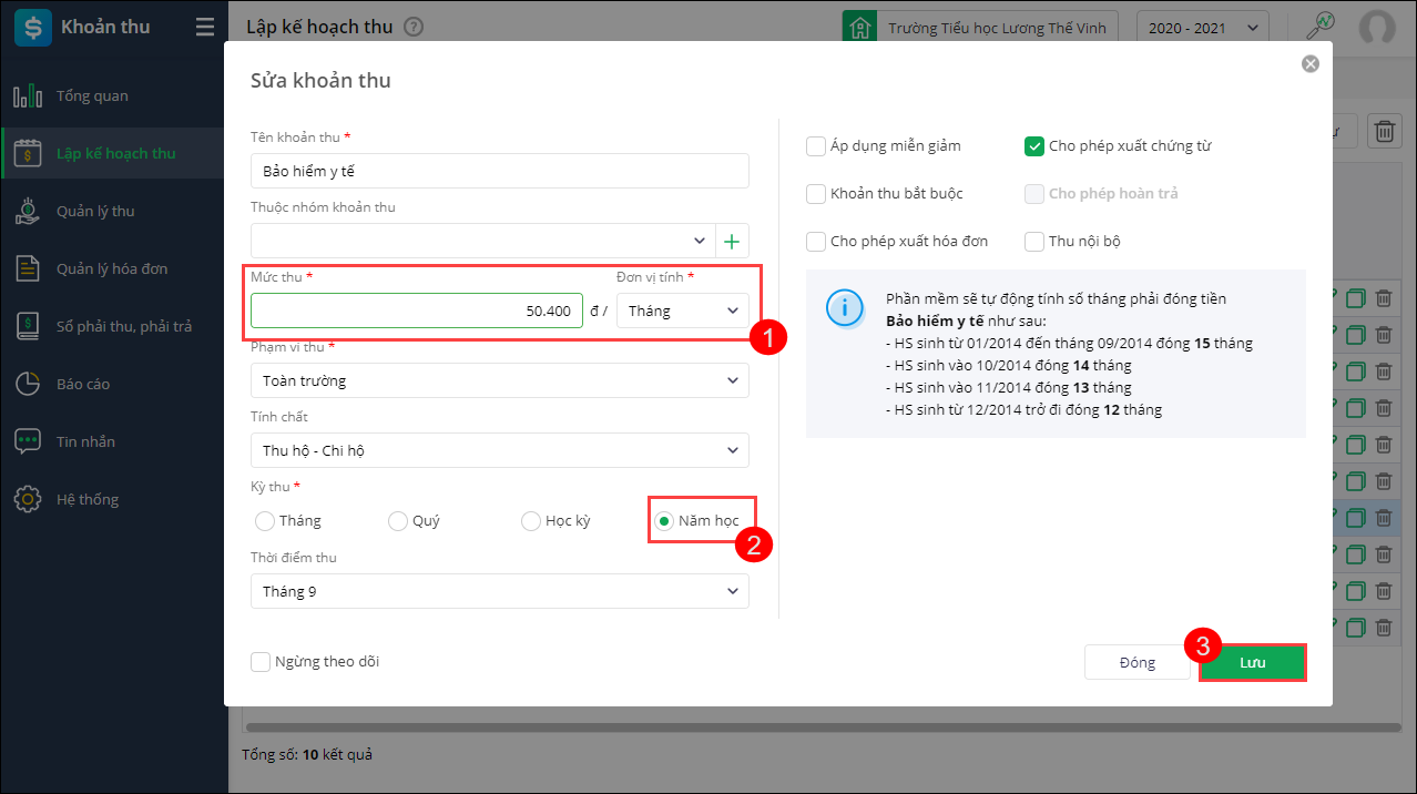 - Nhập lại thông tin Mức thu theo tháng và Kỳ thu theo Năm học