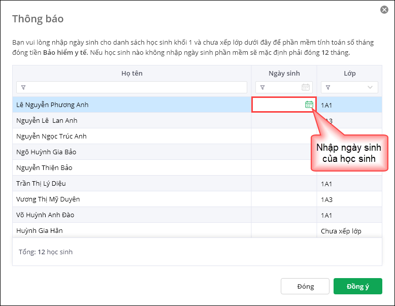 Anh chị thực hiện nhập ngày sinh của học sinh. Trường hợp anh/chị không nhập ngày sinh nào thì phần mềm mặc định học sinh đó phải đóng 12 tháng tiền BHYT.