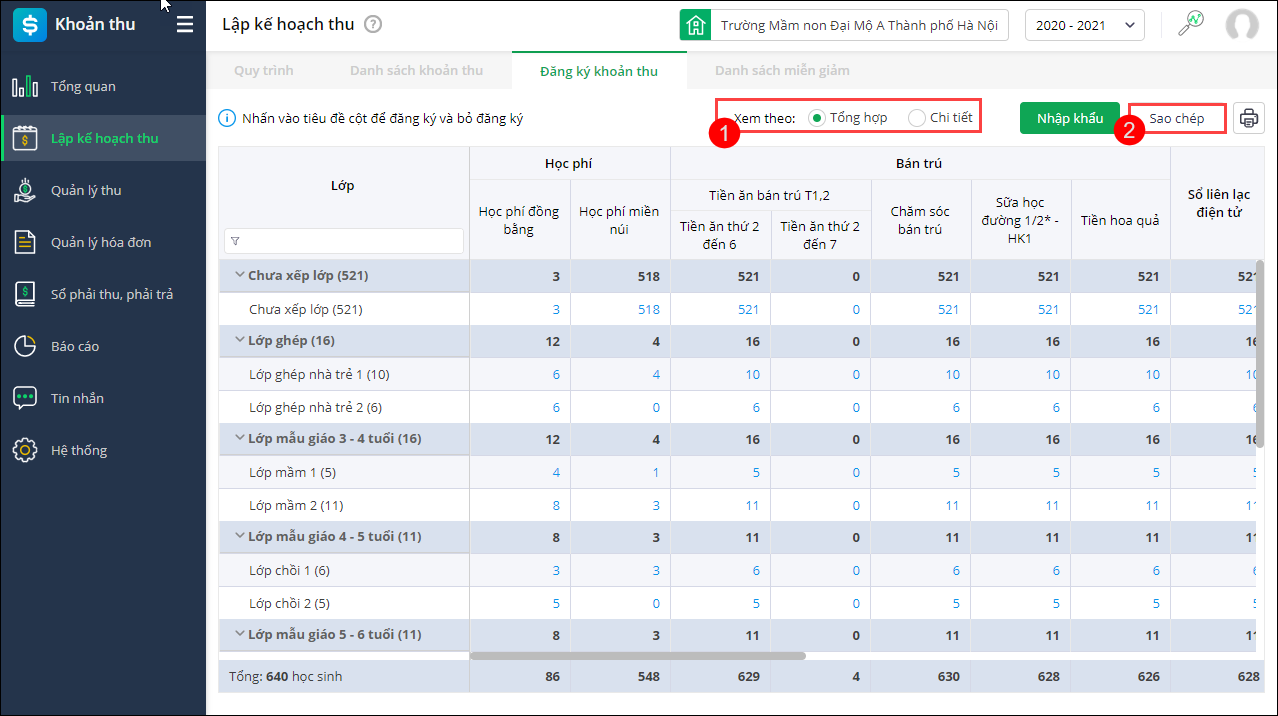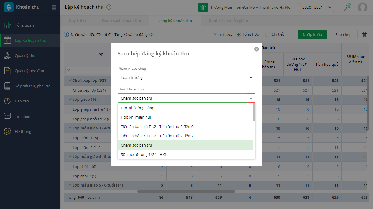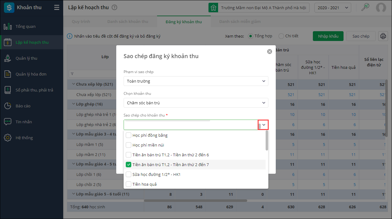 - Chọn Phạm vi sao chép đăng ký khoản thu.