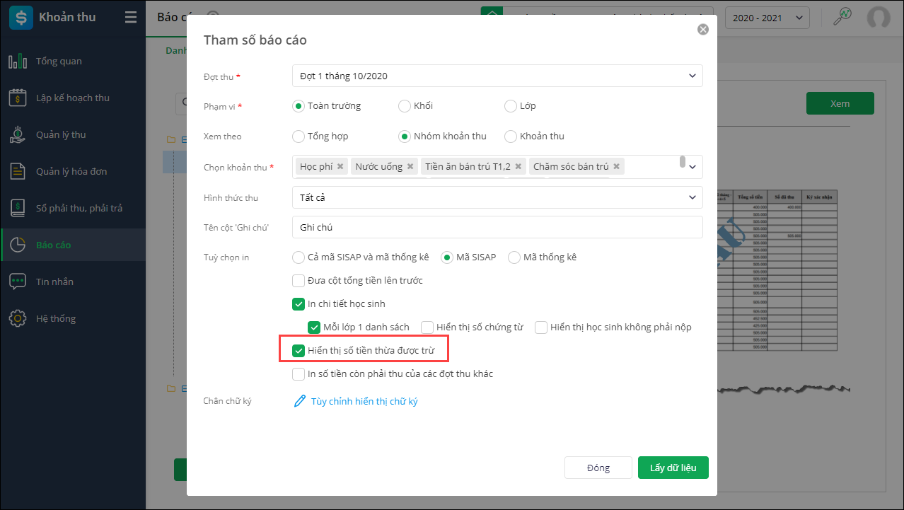 Bổ sung tích chọn Hiển thị số tiền thừa được trừ để hiển thị số tiền còn dư từ đợt trước được trừ vào đợt thu này