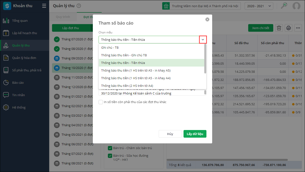Kế toán muốn thông báo thu tiền cả số tiền còn dư từ đợt trước để phụ huynh biết chính xác số tiền trong đợt này