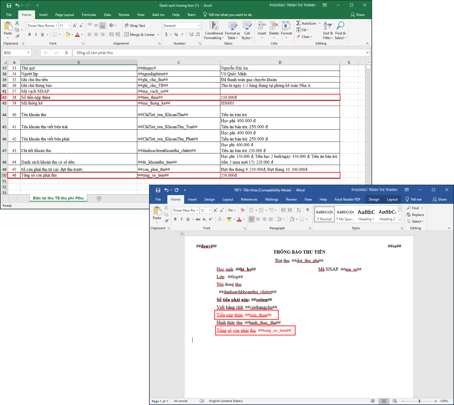 Ví dụ: Nếu muốn hiển thị tổng số tiền còn phải nộp bao gồm cả số tiền còn dư từ đợt trước để phụ huynh nắm bắt được số tiền cần nộp, tại phần Trường trộn trên Danh sách mẫu trộn vừa tải về anh/chị copy ##tien_thua## (số tiền còn còn dư từ đợt trước) và ##tong_so_tien## (= số tiền phải thu tháng này – số tiền còn thừa đợt trước) sang dòng tương ứng vào mẫu trộn vừa tải về.
