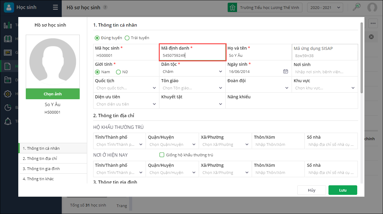 Anh/chị bổ sung thông tin mã định danh khi thêm mới/chỉnh sửa hồ sơ học sinh