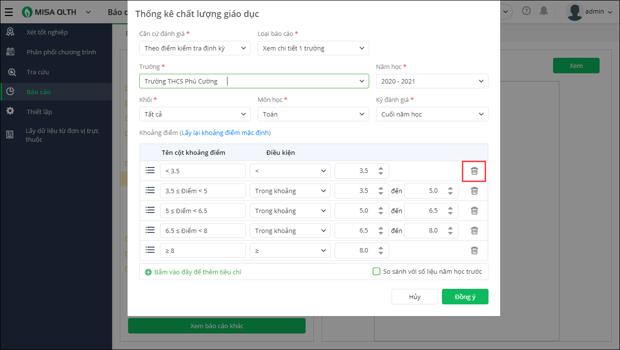 • Nhấn vào biểu tượng thùng rác tại khoảng điểm muốn xóa để xóa khoảng điểm đó.