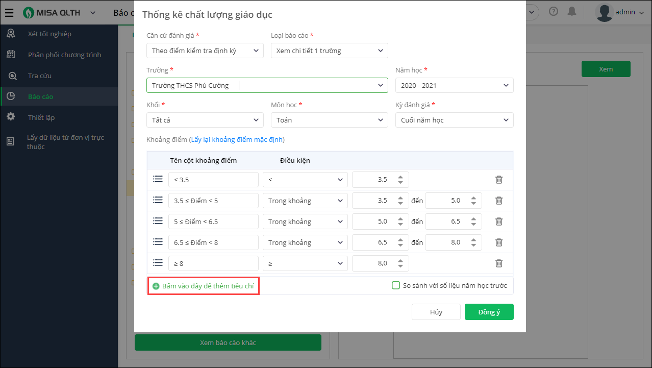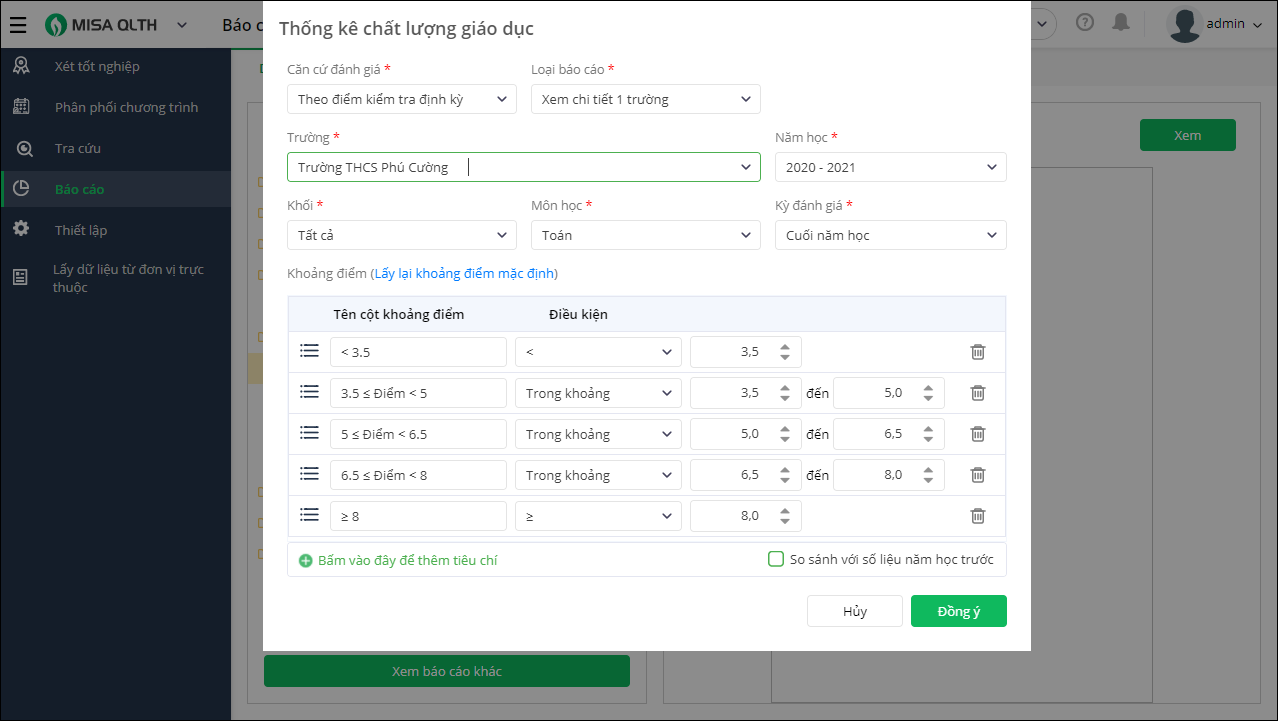 • Loại báo cáo: Xem chi tiết theo từng trường hoặc Tổng hợp số liệu nhiều trường