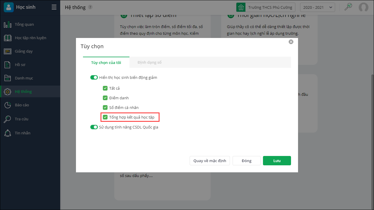 - Bổ sung tùy chọn Hiển thị học sinh biến động giảm trên Bảng tổng hợp kết quả học tập