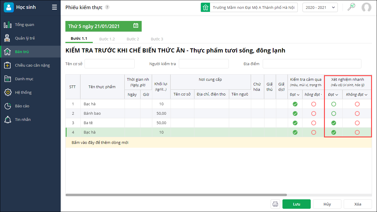 - Vào Học sinh\Bán trú\Phiếu kiểm thực