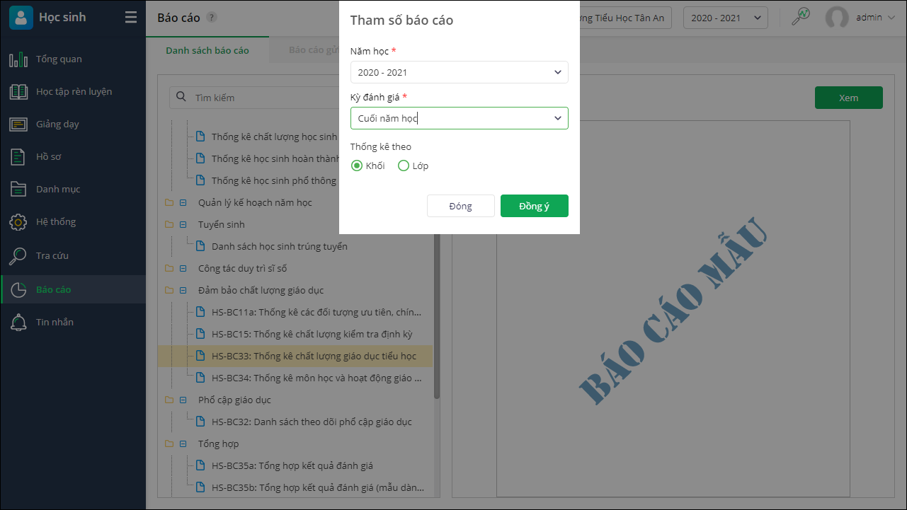 - Khai báo tham số trên báo cáo: Chọn năm học và Kỳ đánh giá