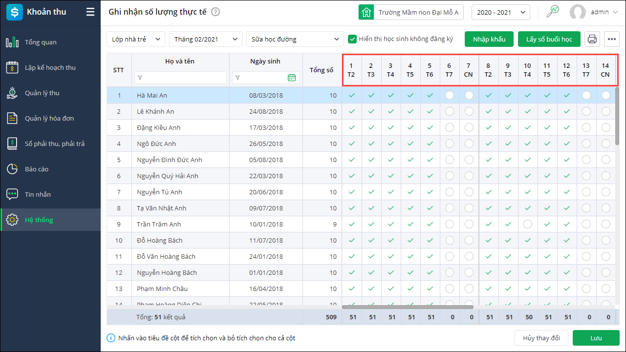 - Từ phiên bản R107: Bổ sung thông tin “Thứ” trên các màn hình ghi nhận số lượng thực tế, mẫu nhập khẩu số buổi sử dụng giúp kế toán dễ dàng đối chiếu.