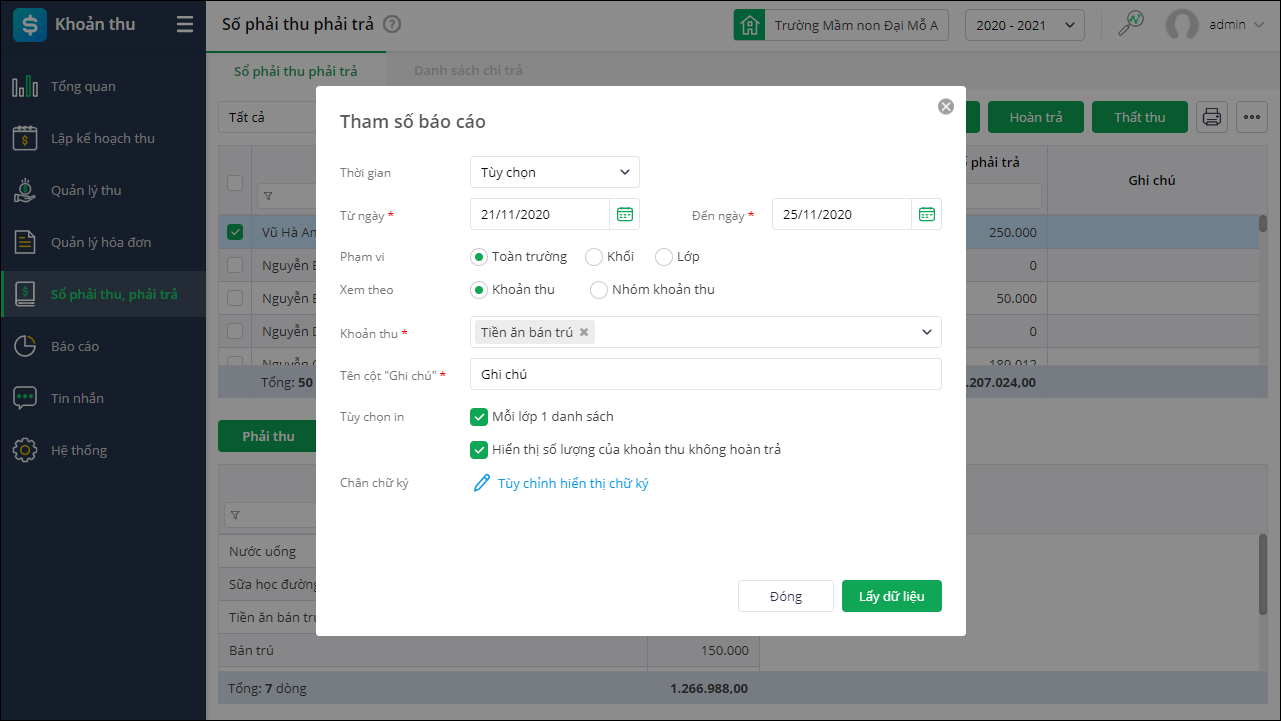 Lưu ý: Trường hợp không muốn hiển thị khoản thu không cần hoàn trả thì bỏ tích chọn Hiển thị số lượng khoản thu không hoàn trả
