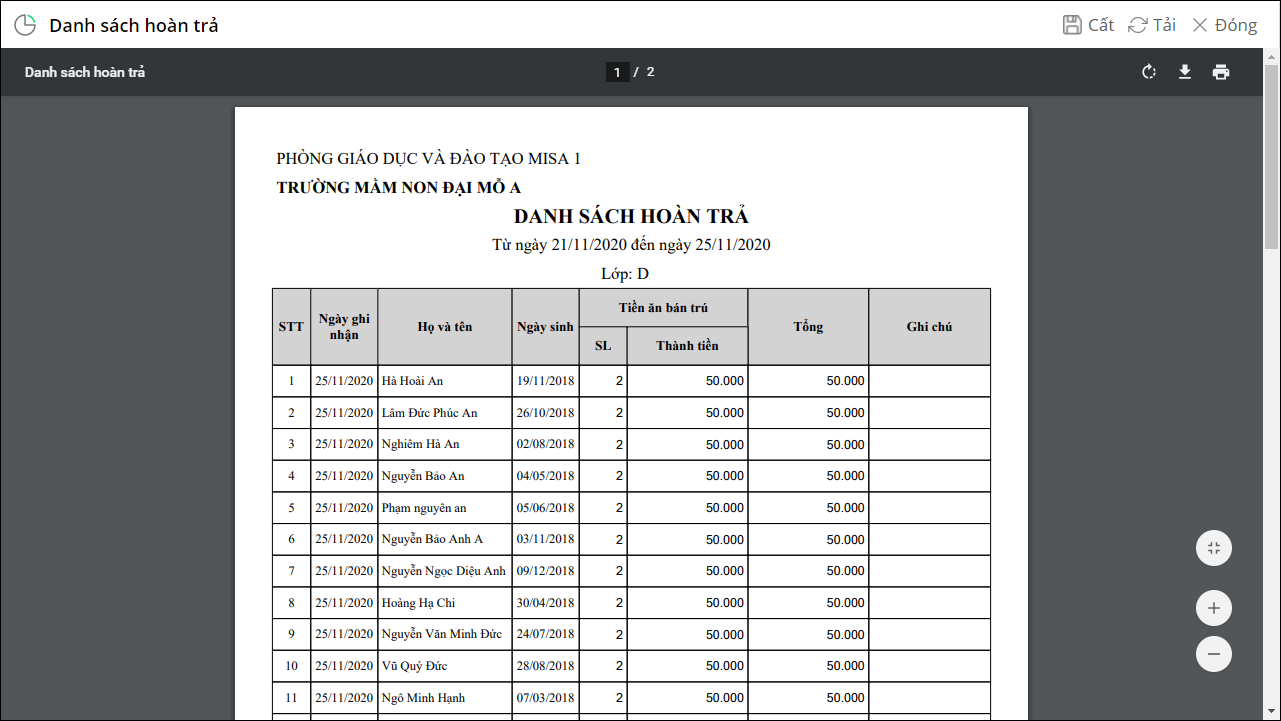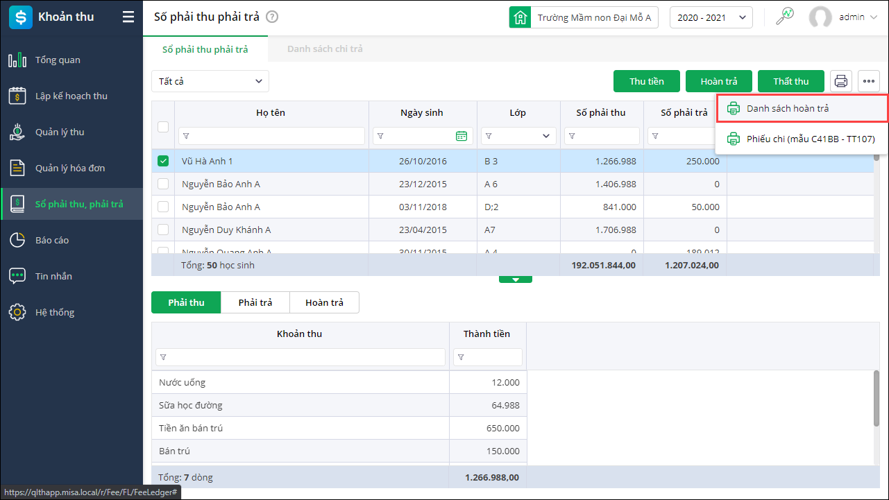 - Nhấn biểu tượng máy in, chọn Danh sách hoàn trả