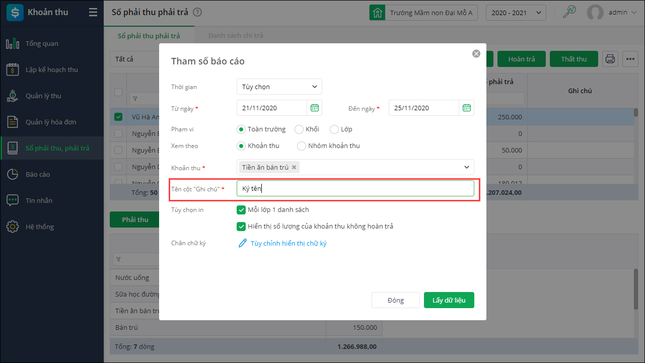 Bỏ tích chọn với những khoản thu/nhóm khoản thu không muốn lên bảng kê - Anh/chị có thể chỉnh sửa tên cột Ghi chú thành ký nhận, xác nhận,… theo nhu cầu của đơn vị