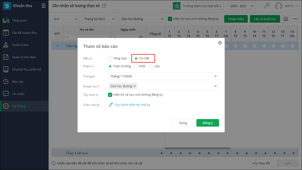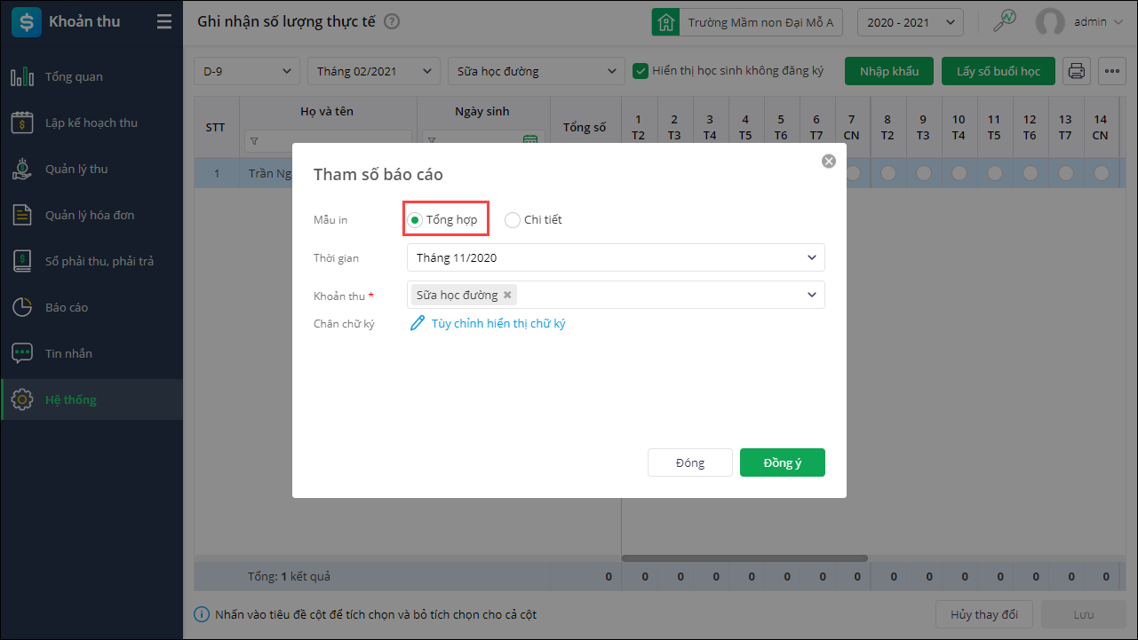 - Từ phiên bản R107: Bổ sung tính năng chọn mẫu in (tổng hợp hoặc chi tiết ) khi thực hiện in dánh sách theo dõi số buổi sử dụng giúp kế toán in bảng tổng hợp số buổi ăn bán trú của từng lớp theo ngày.