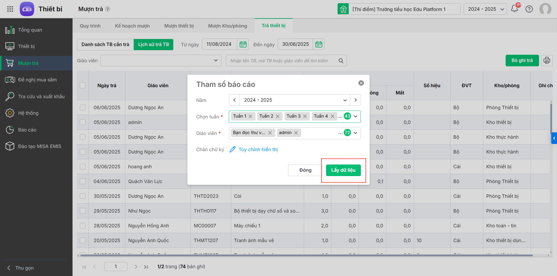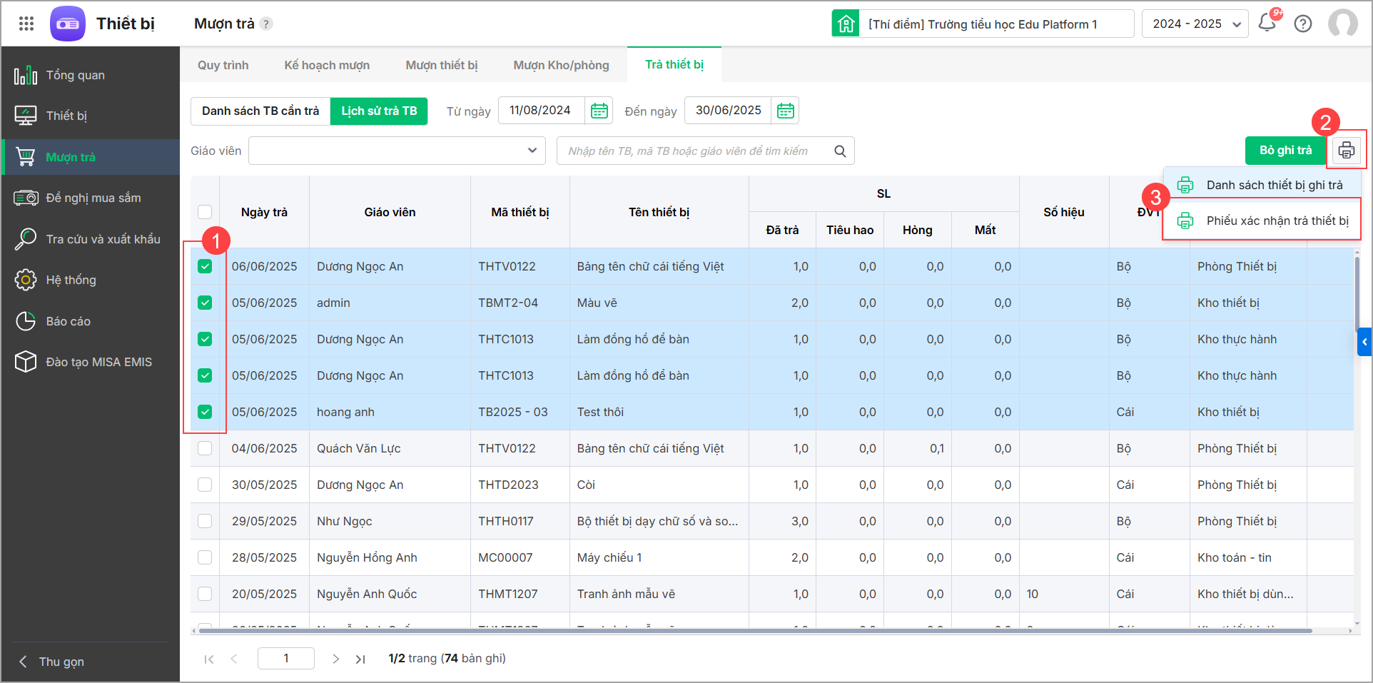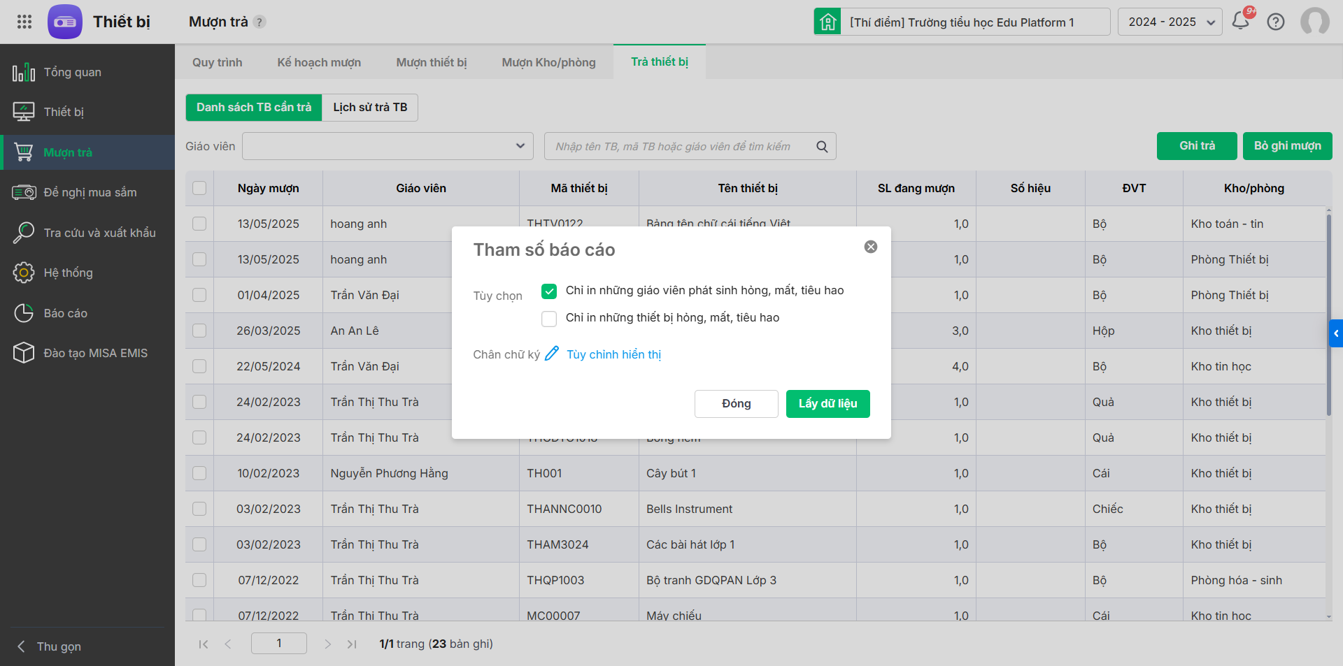 - Giáo viên: Chọn danh sách giáo viên đã trả thiết bị.