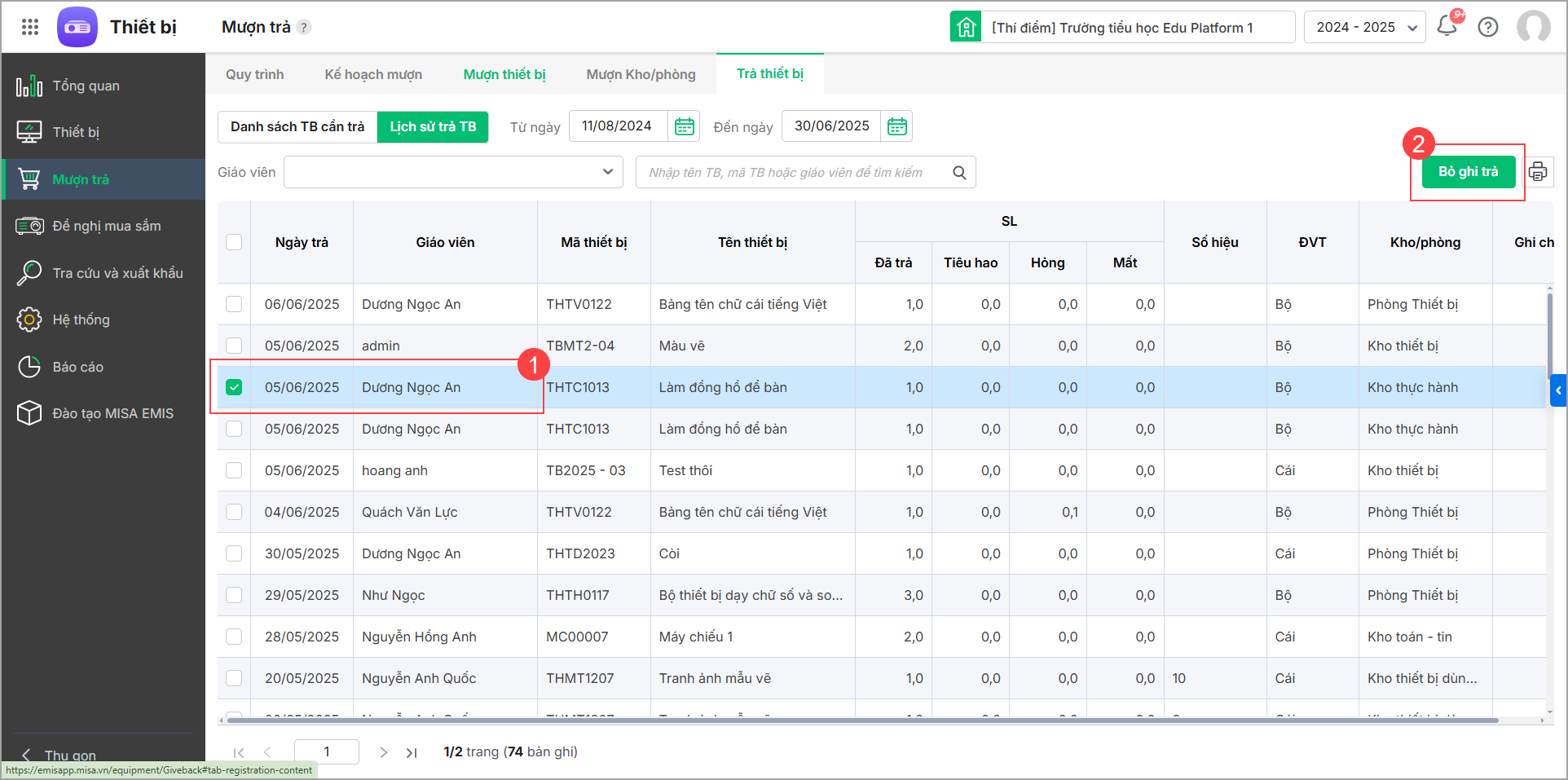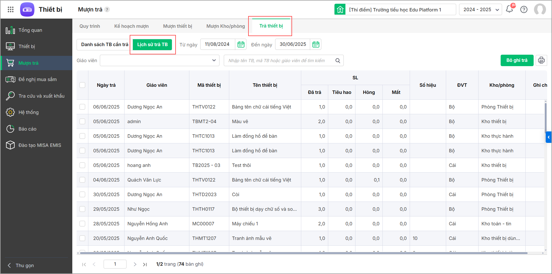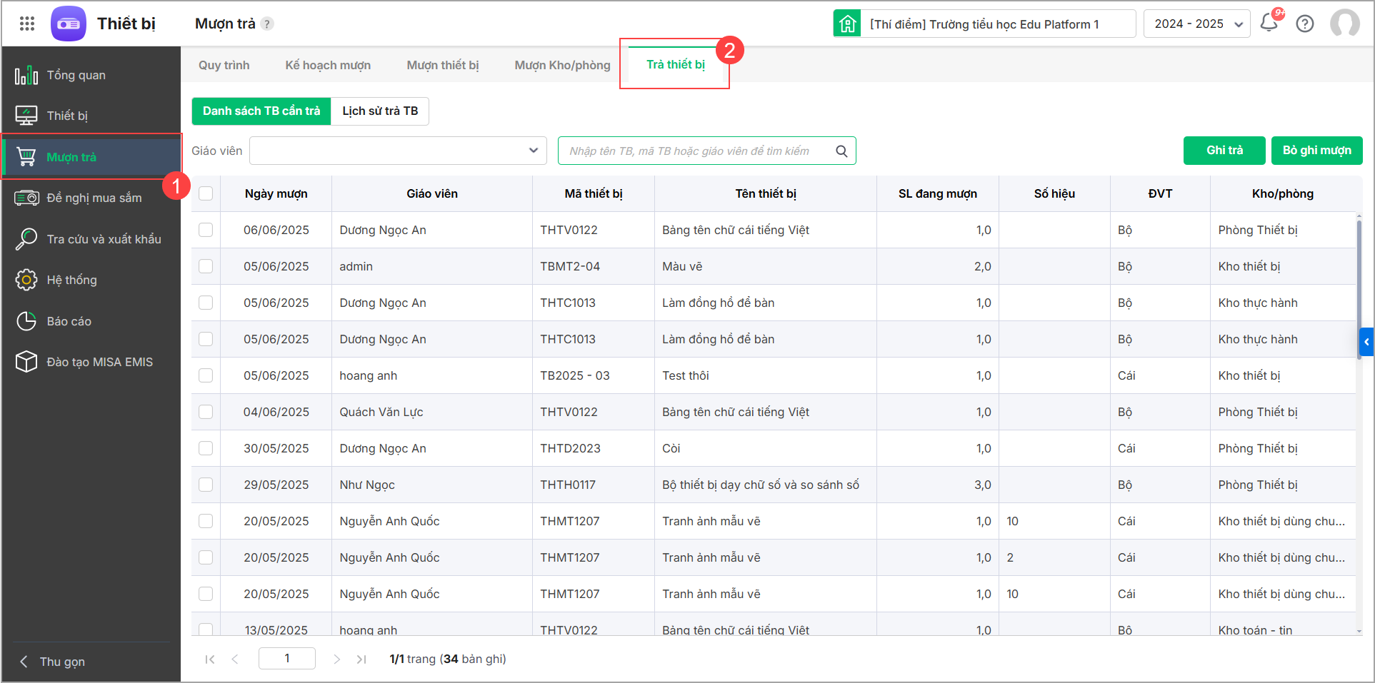 - Giáo viên: Chọn danh sách giáo viên đã trả thiết bị.