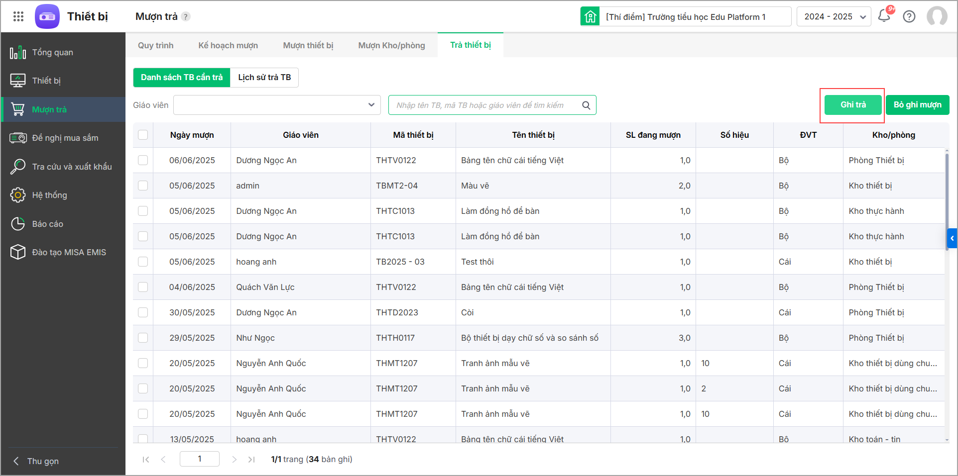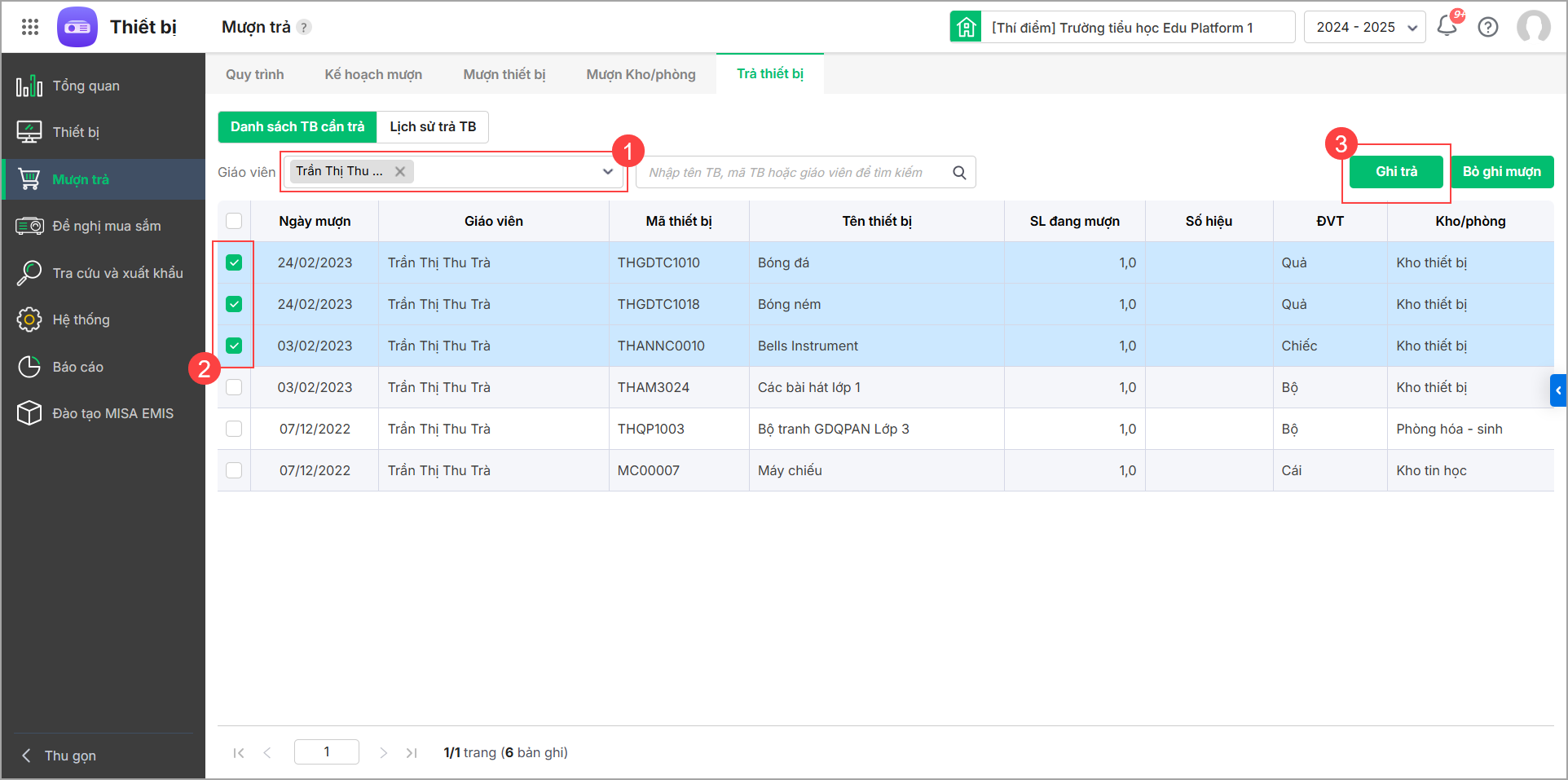 Hoặc tại màn hình Danh sách TB cần trả, tích chọn các các thiết bị mượn của giáo viên, chọn Ghi trả.