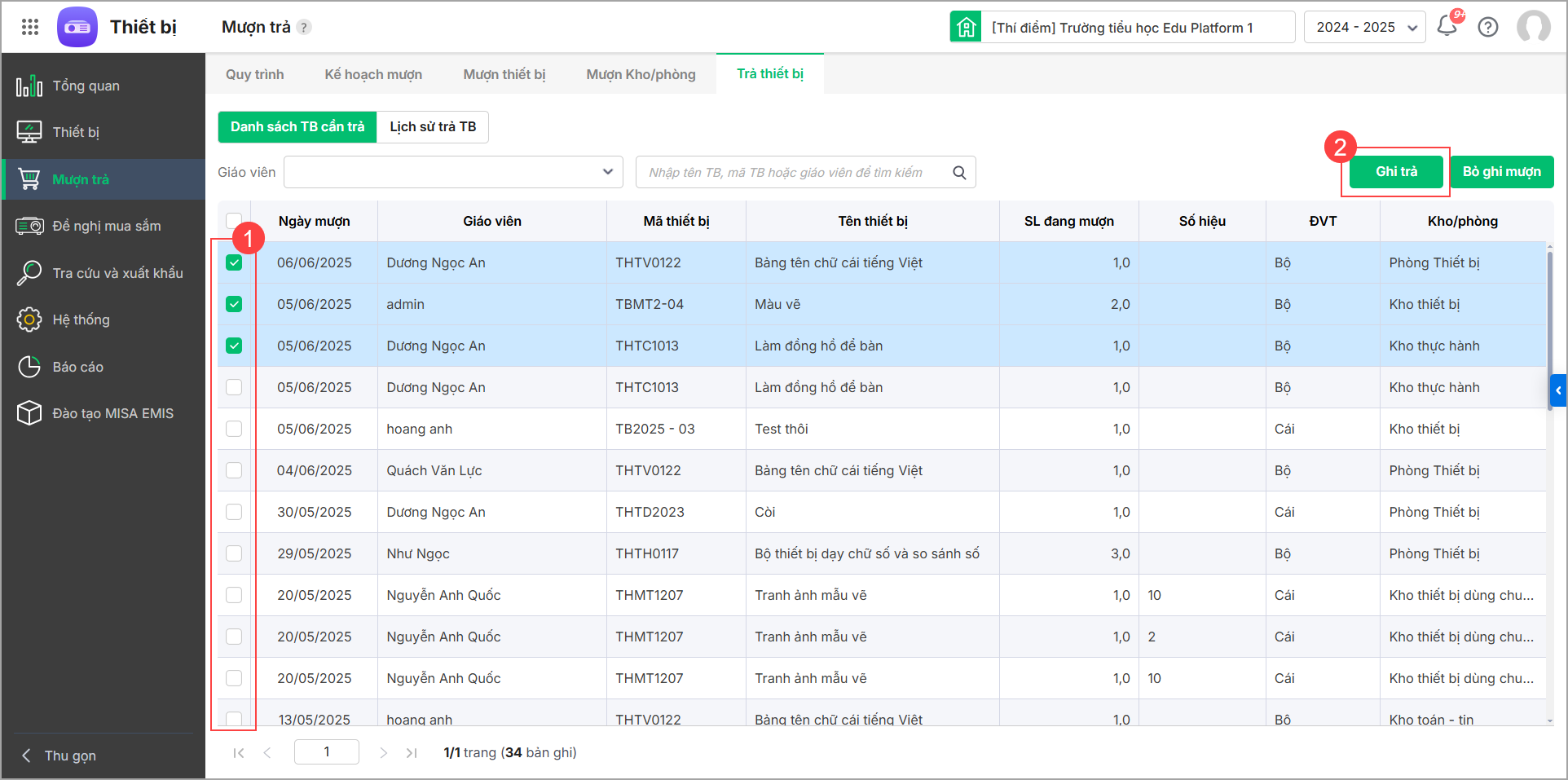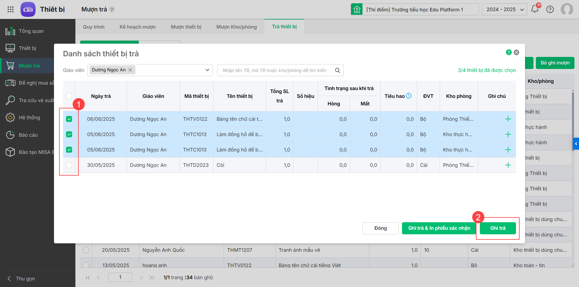 - Tại mục Danh sách TB cần trả, chọn Ghi trả và tích chọn những giáo viên cần ghi trả thiết bị.