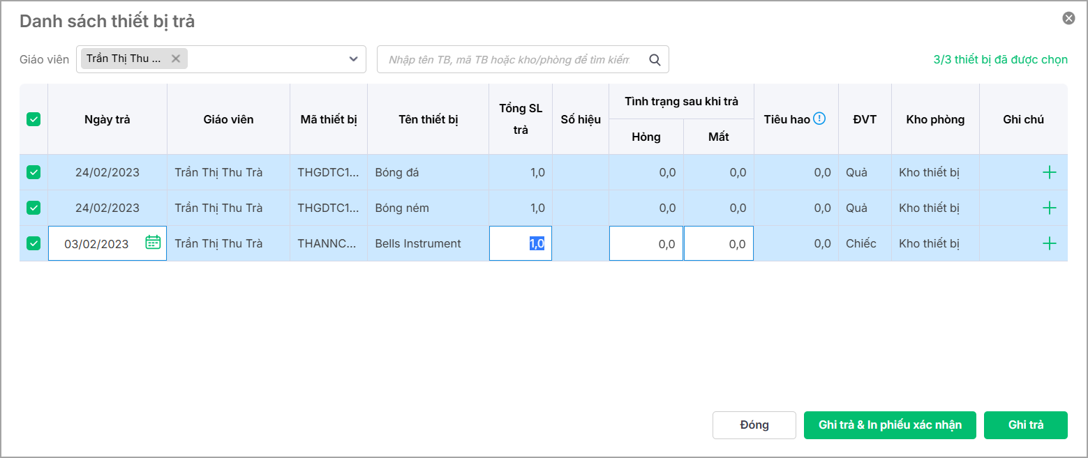 Cách 2: Ghi trả 1 số thiết bị đã mượn của 1 giáo viên