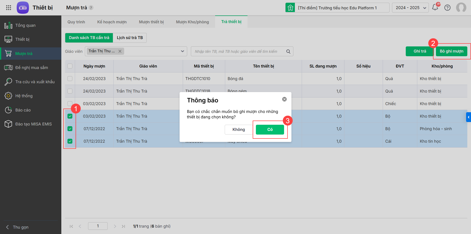 Lưu ý: Trường hợp Cán bộ thiết bị ghi mượn nhầm hoặc đã ghi mượn nhưng giáo viên không đến mượn thiết bị thì có thể thực hiện Bỏ ghi mượn.