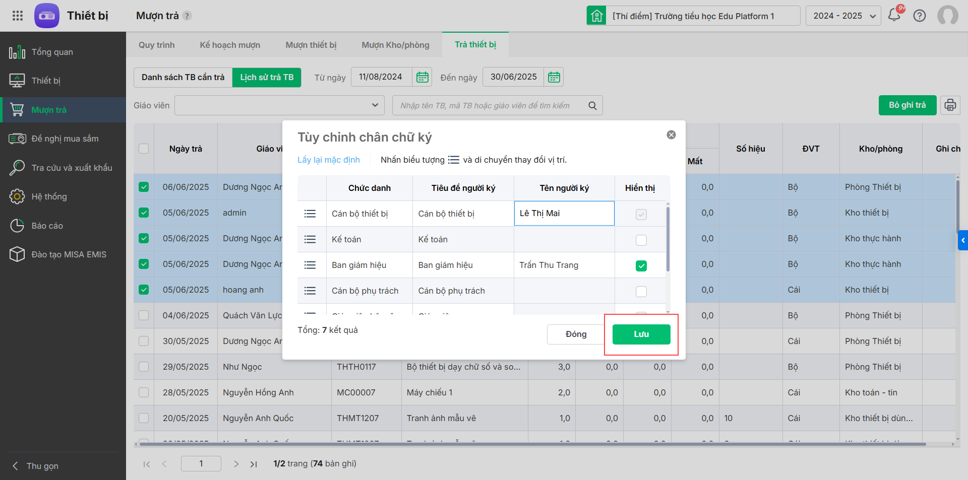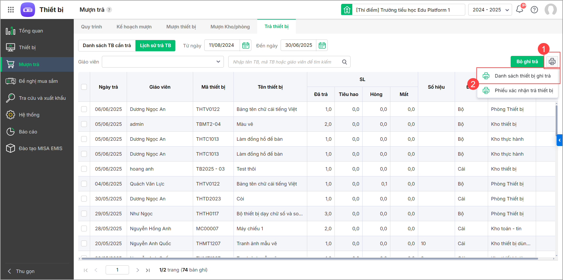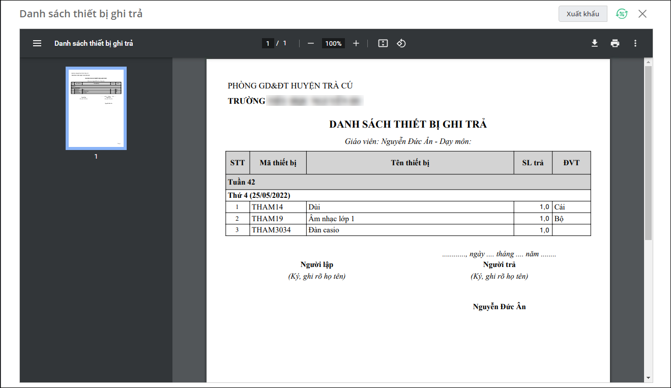 Cán bộ thiết bị có thể in danh sách thiết bị đã ghi trả để đưa giáo viên ký xác nhận và lưu trữ theo quy định quản lý của nhà trường: