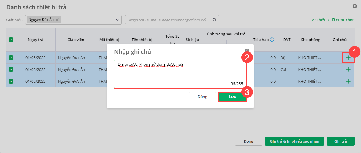 Lưu ý: Nếu muốn mô tả chi tiết tình trạng thiết bị, nhấn vào biểu tượng dấu cộng tại cột Ghi chú để nhập ghi chú. Nhấn Lưu để thêm ghi chú.