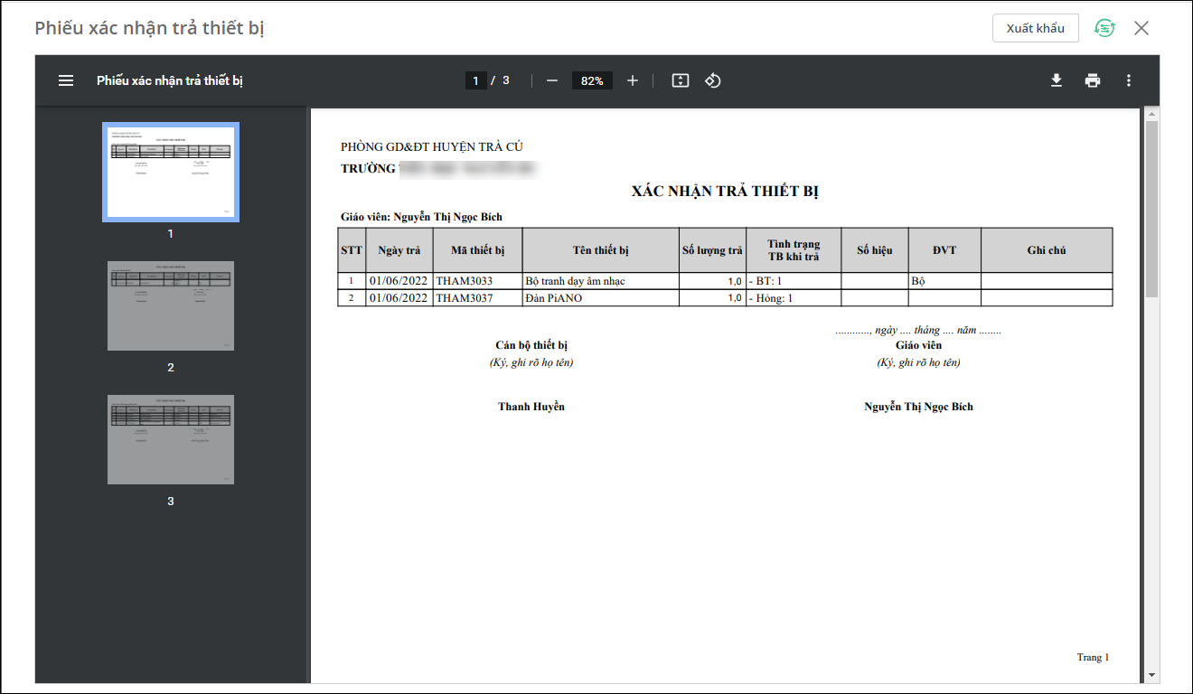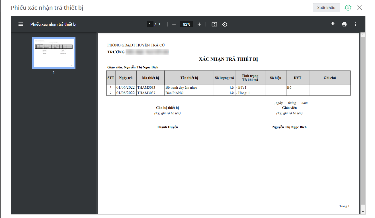 Trường hợp giáo viên trả thiết bị có ghi nhận hỏng, mất, tiêu hao,… Cán bộ thiết bị có thể in phiếu xác nhận trả thiết bị của riêng lượt mượn này cho giáo viên ký xác nhận ngay: